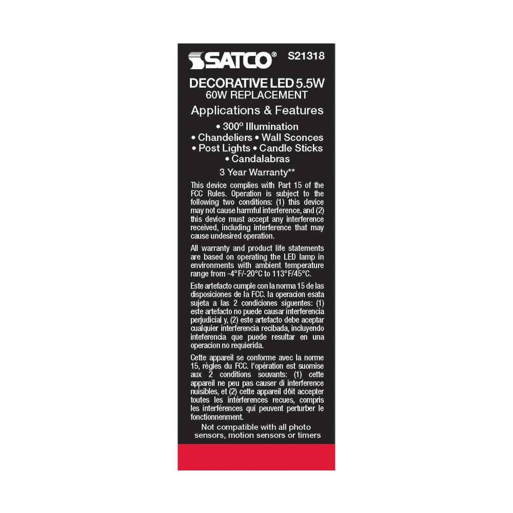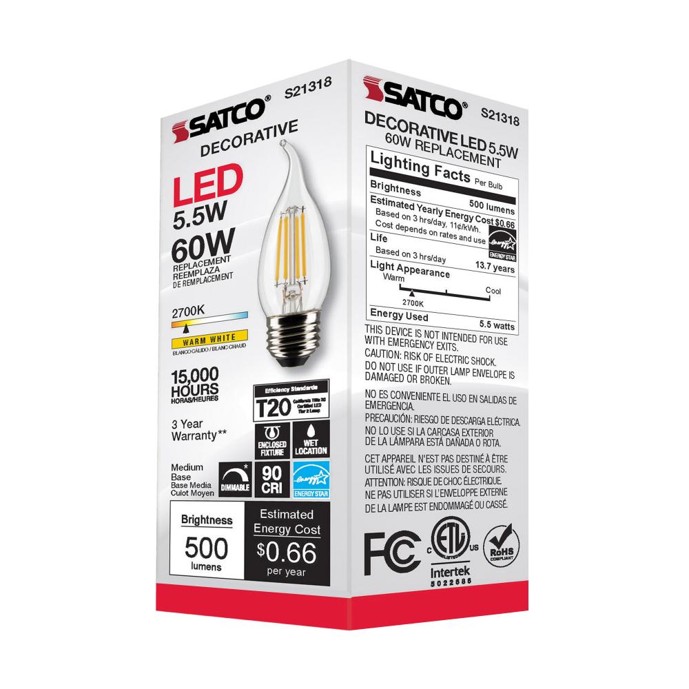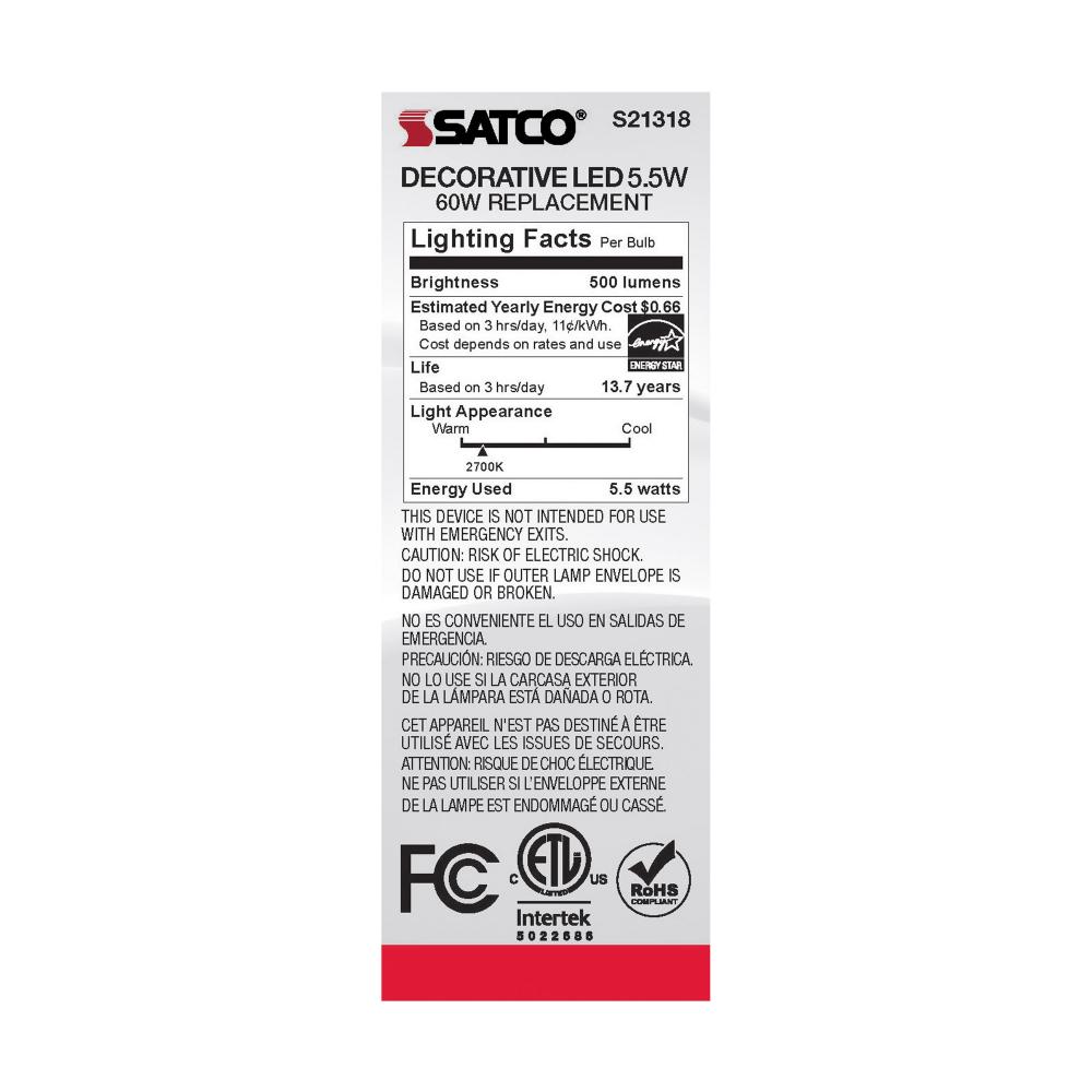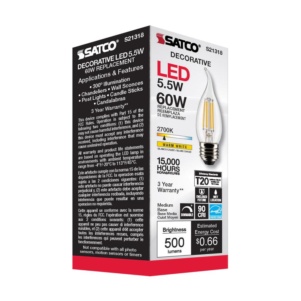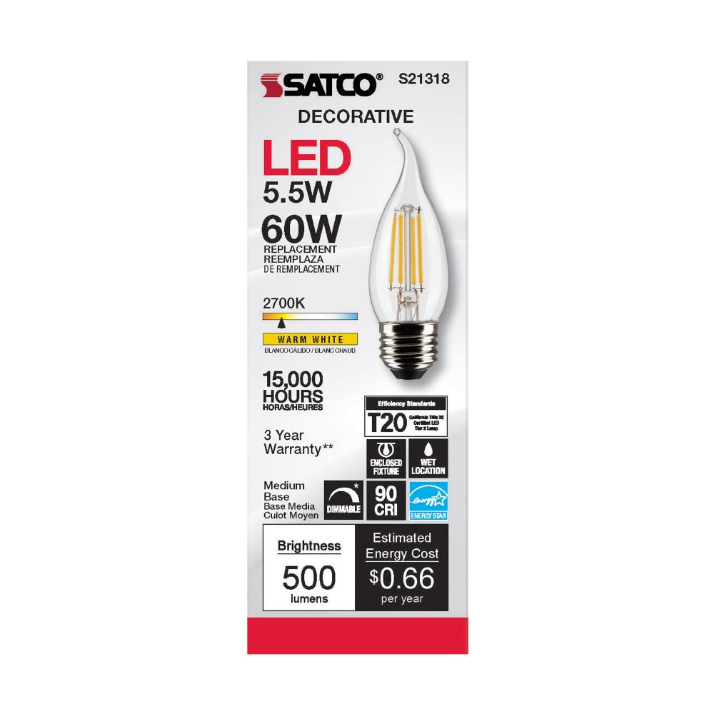 Satco's S21318 5.5-watt, LED lamp is traditional, yet contemporary with its vintage style and energy saving LED technology. Elegantly illuminate any room in the house with this dimmable, clear bulb. Sophisticated and modern, this lamp delivers 15,000 h
