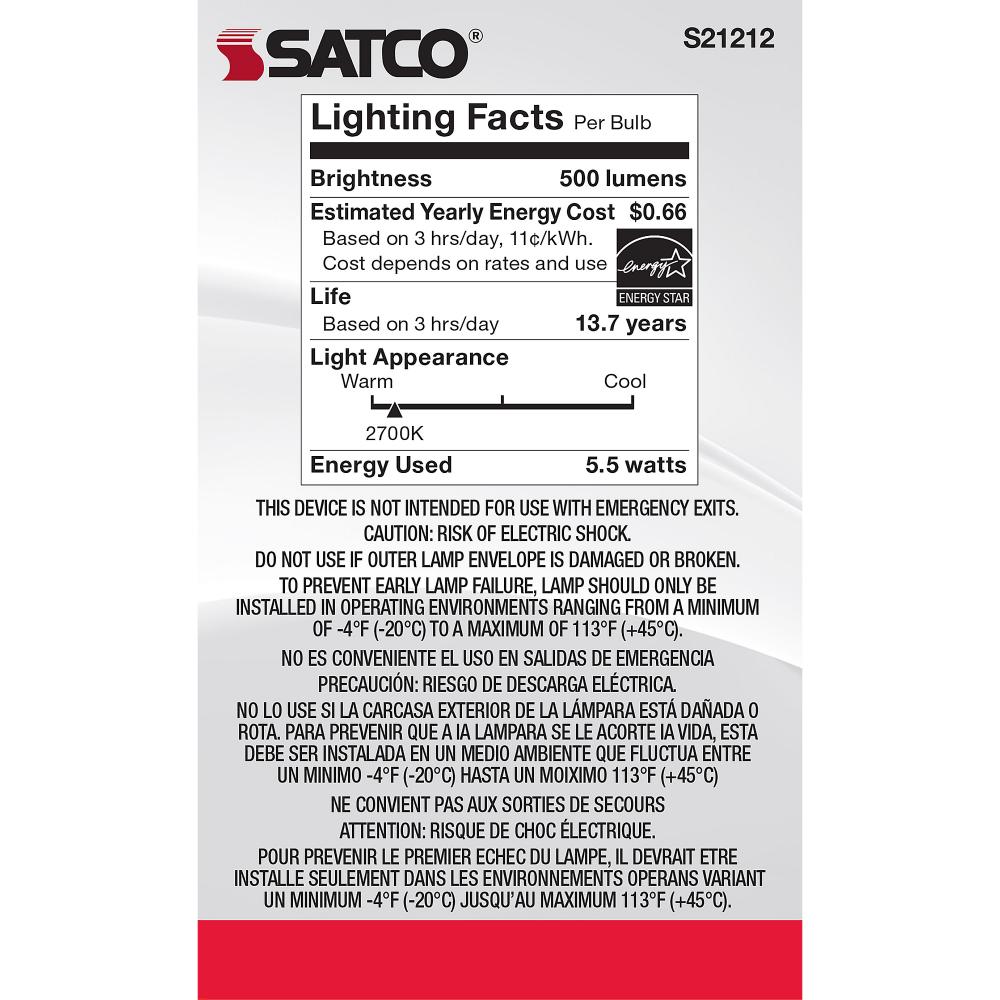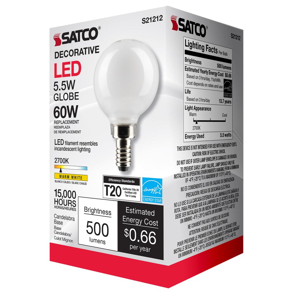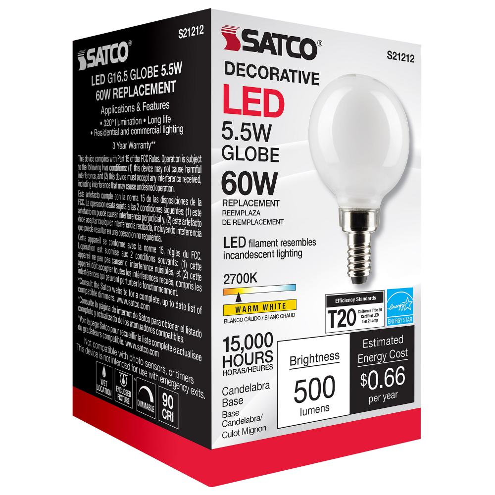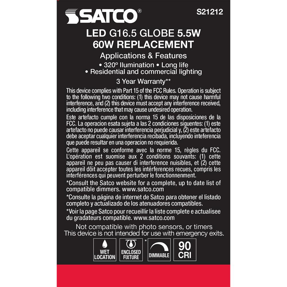 Satco's S21212 5.5-watt LED lamp is traditional, yet contemporary with its sleek finish and energy saving LED technology. Elegantly illuminate any room in the house with this dimmable, globe shaped bulb. Sophisticated and modern, this lamp delivers 15,