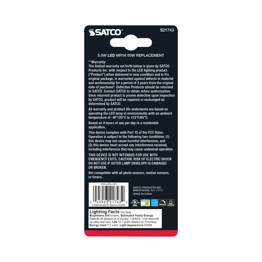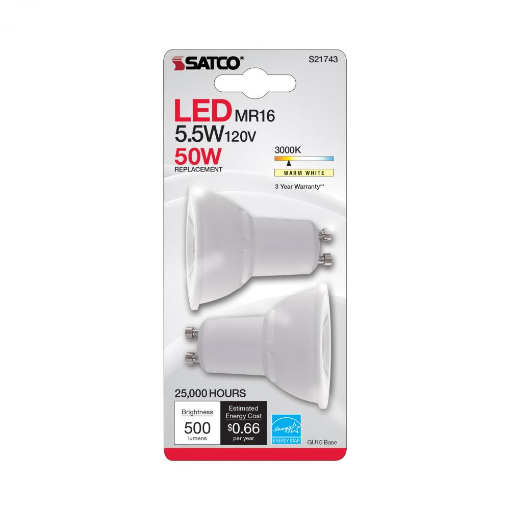 5.5 Watt MR16 LED; GU10 base; 3000K; 120 Volt; 40 deg. Beam Angle; 2-Card