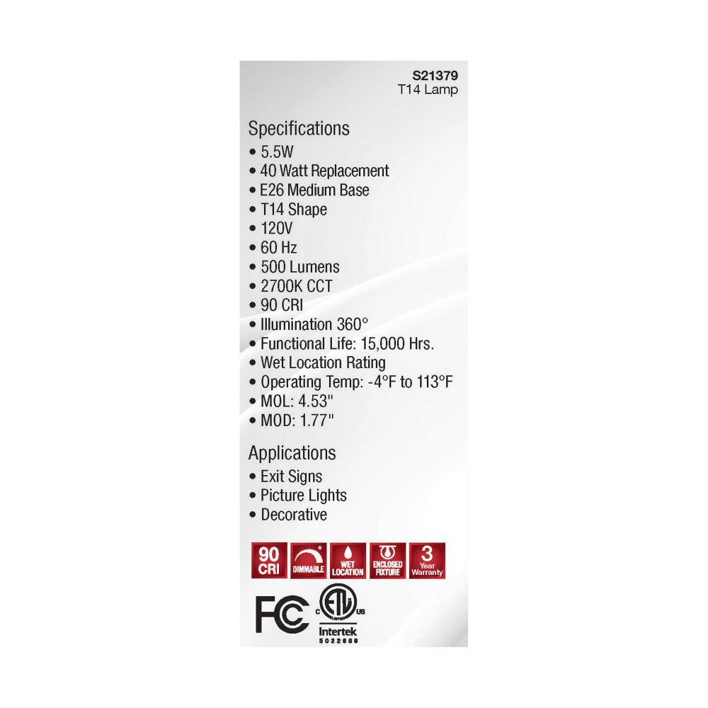 5.5 Watt T14 LED Filament; Clear; Medium Base; 2700K; 500 Lumens; 120 Volt