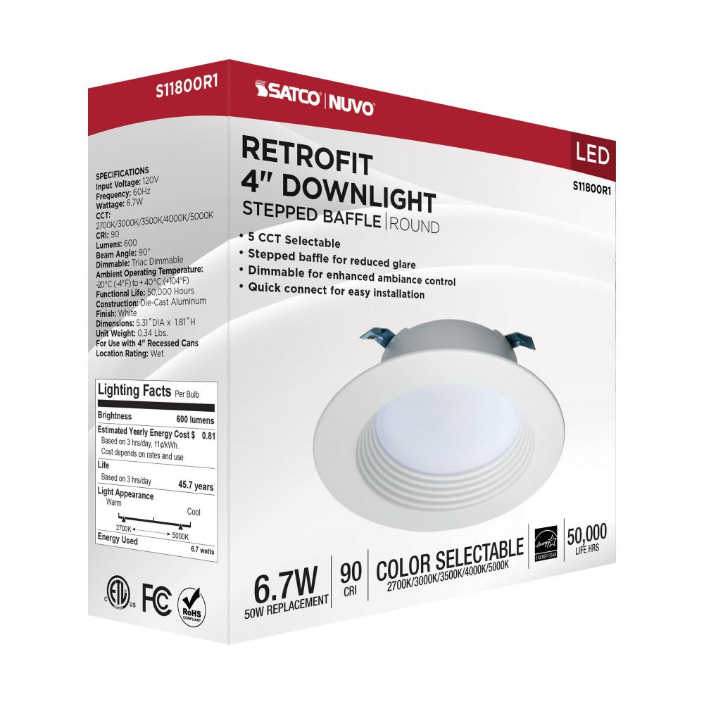 6.7 Watt LED Downlight Retrofit; 4 Inches; CCT Selectable; Round; White Finish; 120 Volt