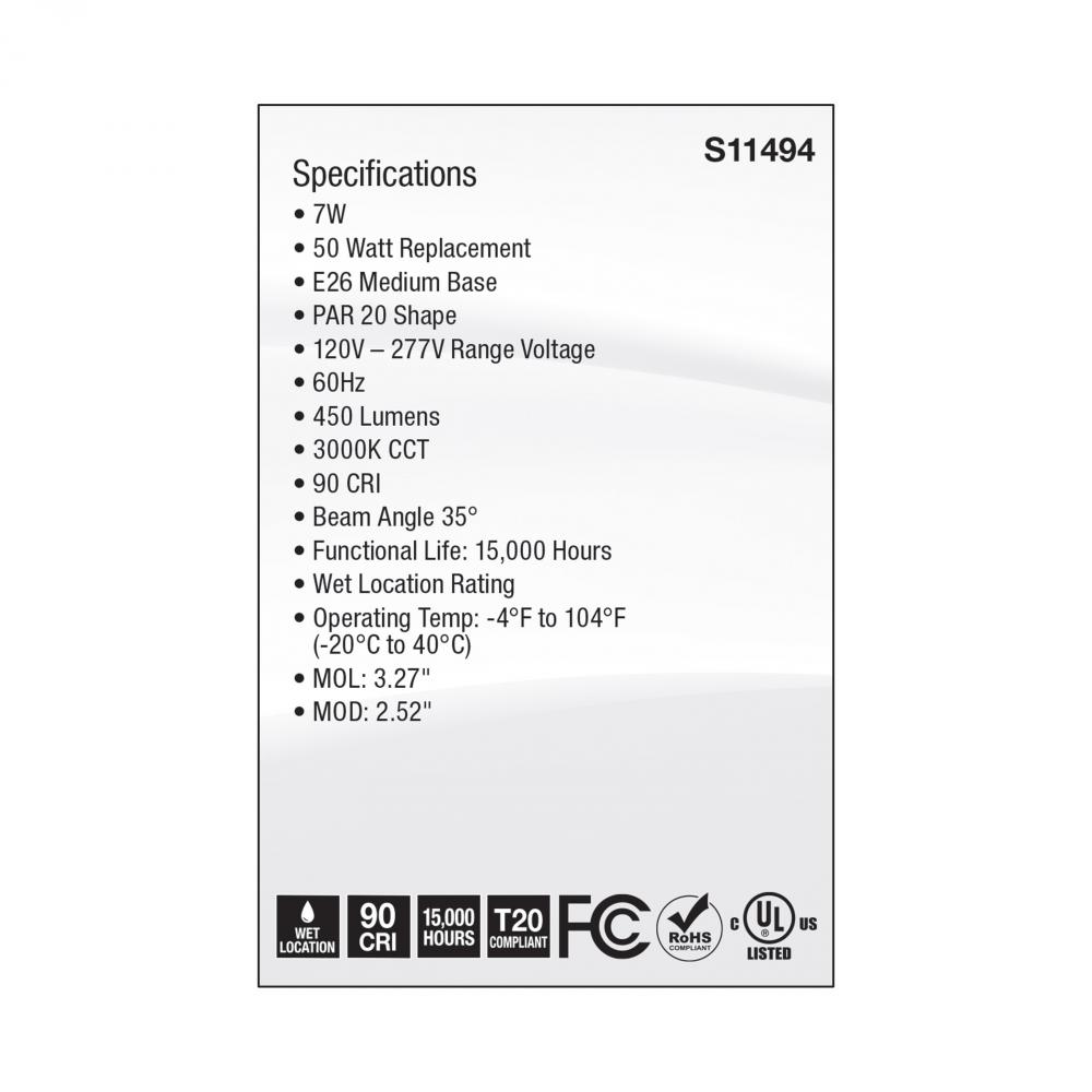 SATCO NUVO's S11494 PAR20 Range Voltage lamp is designed for application in 120V-277V fixtures. With crisp, 90 CRI light output in 3000K, this is an ideal lamp for residential commercial, hospitality, general lighting, recessed downlighting and task li