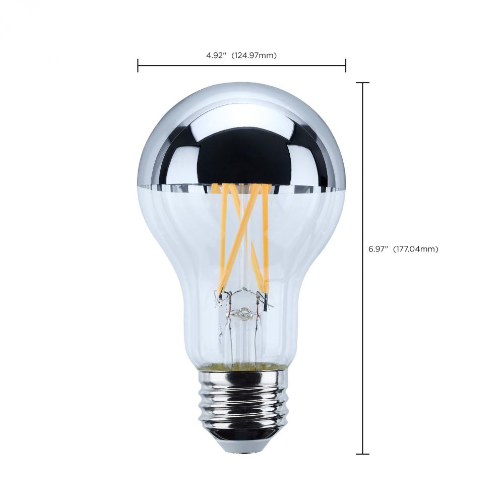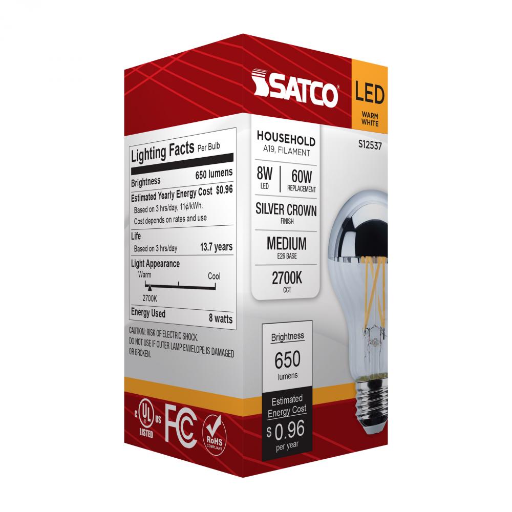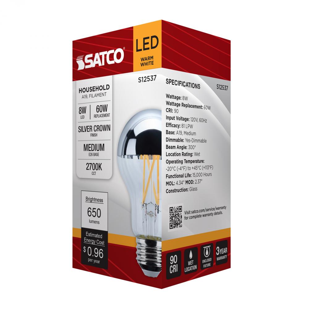 SATCO NUVO's S12537 Silver Crown LED lamp delivers vintage-inspired elegance with modern performance. This 8-watt A19 bulb features a striking half-bowl silver finish that redirects light back into the bulb, producing a soft, ambient glow while reducin