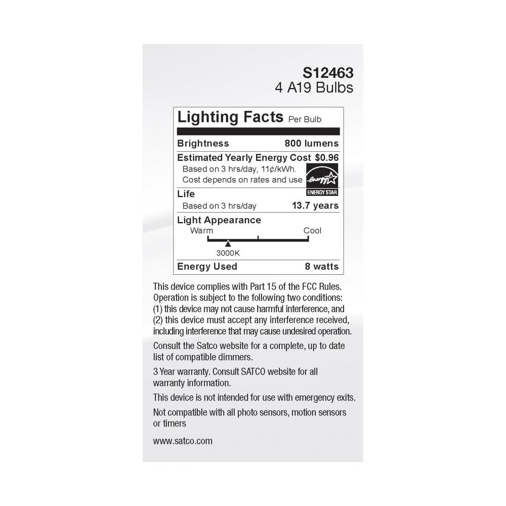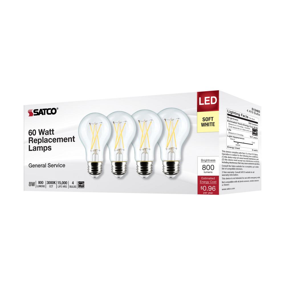 Satco's S12463 8-watt A19 clear bulb is dimmable and offers soft white light and a 280 degree beam spread. Wet rated for kitchens and bathrooms, this bulb features a medium base that fits all standard lamps and fixtures, and provides superior lighting.
