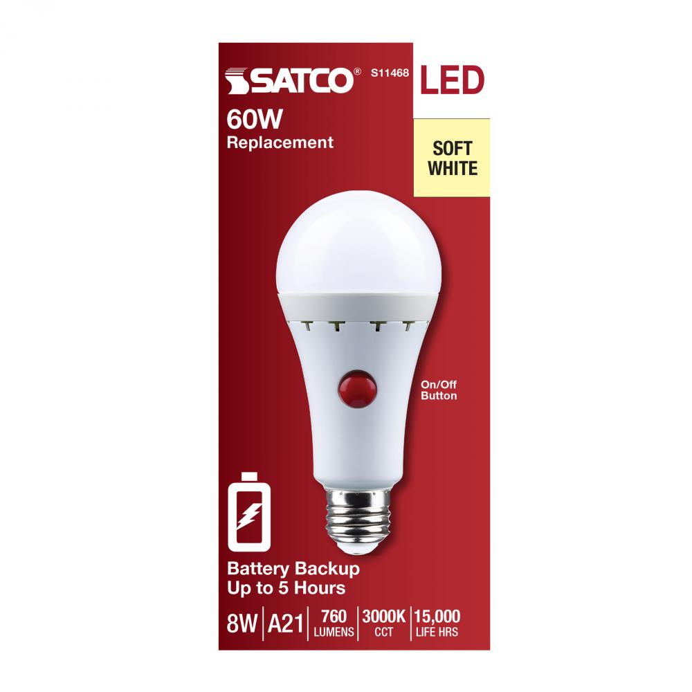 SATCO NUVO's LED A21 battery backup lamps are the ideal lighting solution for residential or commercial applications. Available in 8-watts and either 3000K or 5000K, these lamps provide bright, energy-efficient illumination with a wide 220-degree beam