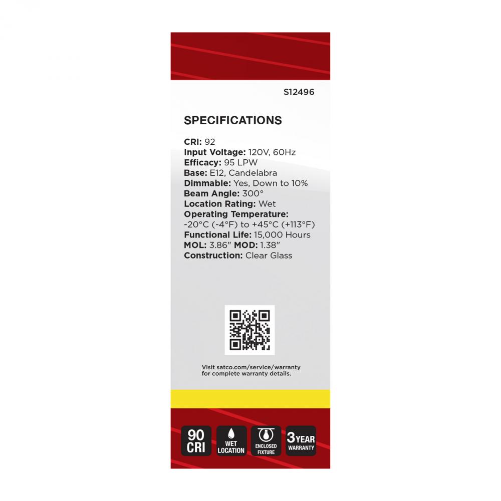 Satco's S12496 8-watt LED bulb is an elegant lighting solution for the home. Perfect for chandeliers, use this dimmable lamp to illuminate living rooms, dining rooms, or anywhere else where a traditional look will complement decorative needs. The bulb