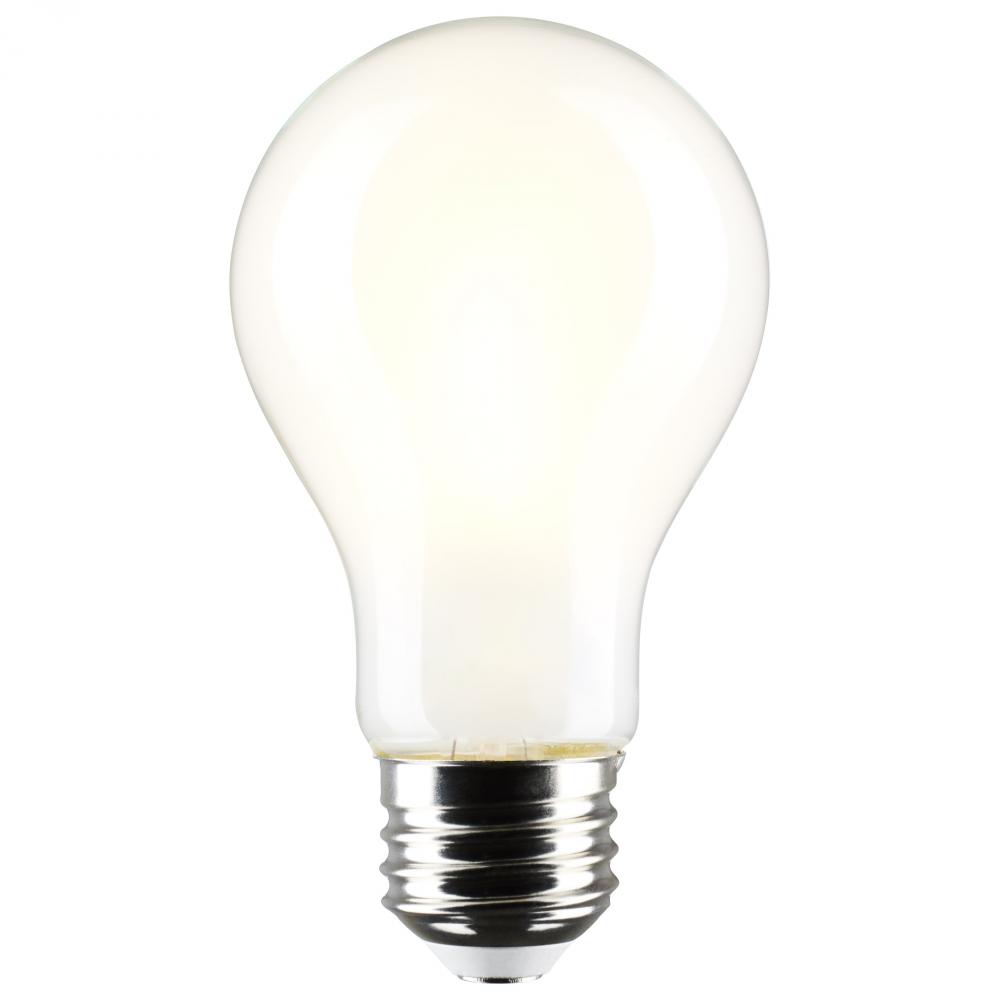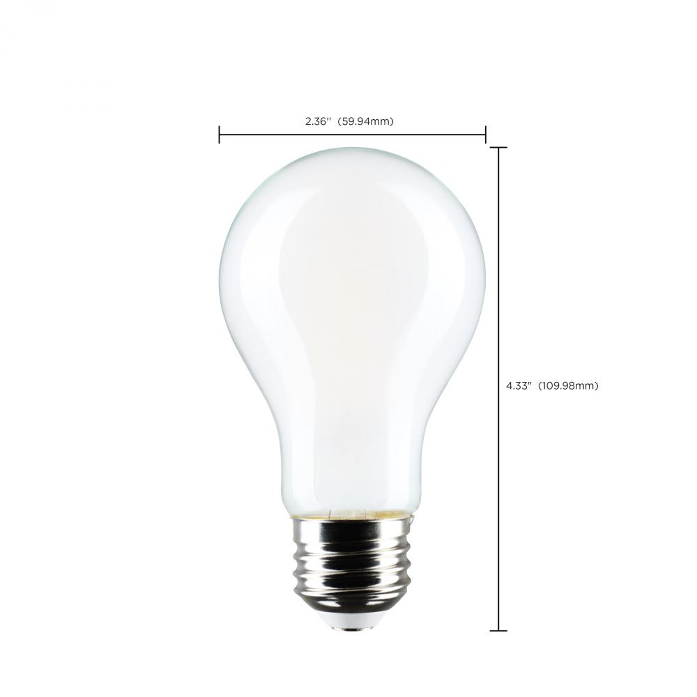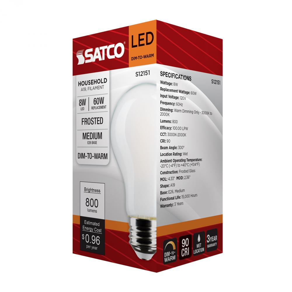 The S12151 Dim to Warm filament A19 bulb by SATCO NUVO delivers cozy, incandescent-style dimming, warming from 3000K to 2000K for an inviting atmosphere. Ideal for residential or decorative use, it features a frosted glass finish for soft diffusion, a stan