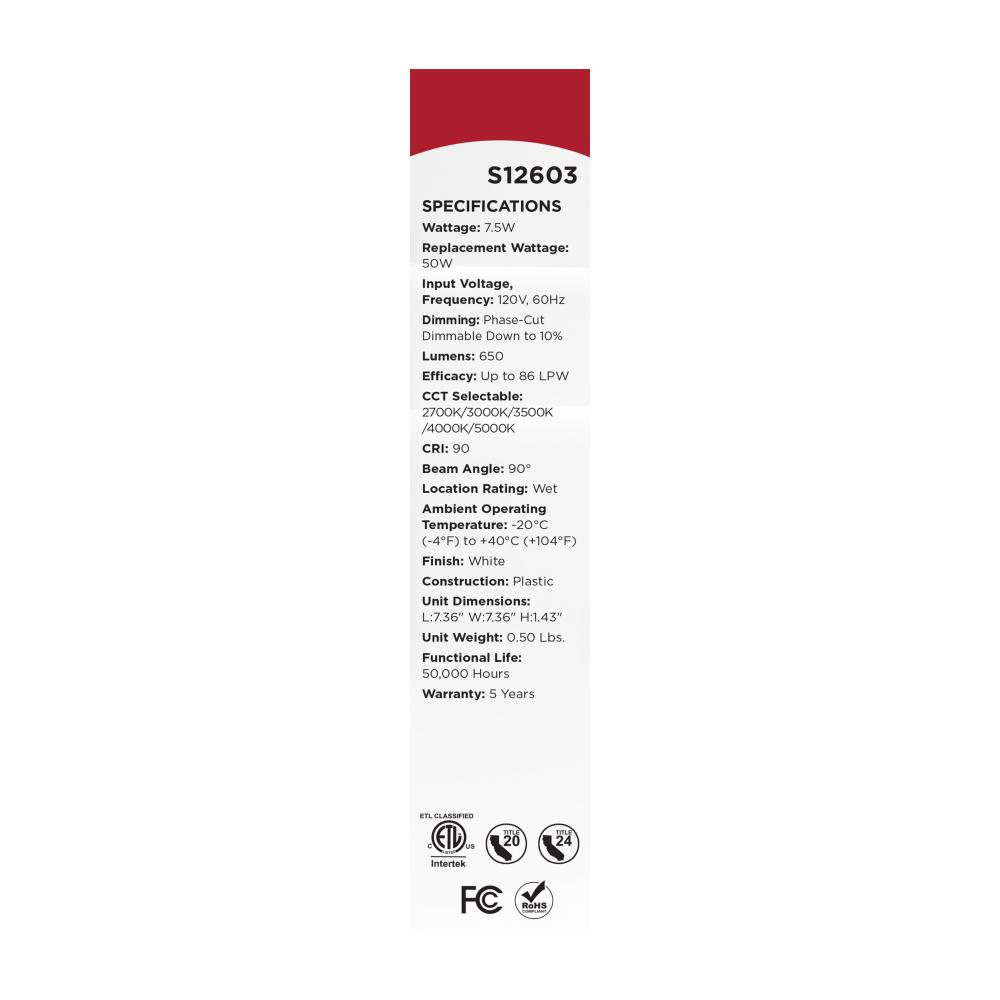 SATCO NUVO's S12603 5/6-inch square, 7.5W, Performer Series LED Retrofit Downlight combines effortless installation with a sleek, functional design. Its smooth regress baffle minimizes glare, while the integrated on-unit switch allows easy selection fr