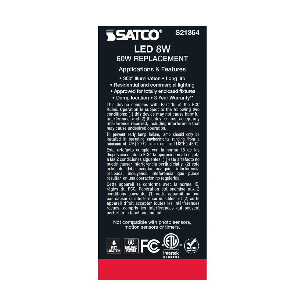Satco's S21364 8-watt, LED lamp is traditional, yet contemporary with its vintage style and energy saving LED technology. Elegantly illuminate any room in the house with this dimmable, clear bulb. Sophisticated and modern, this lamp delivers 15,000 hou