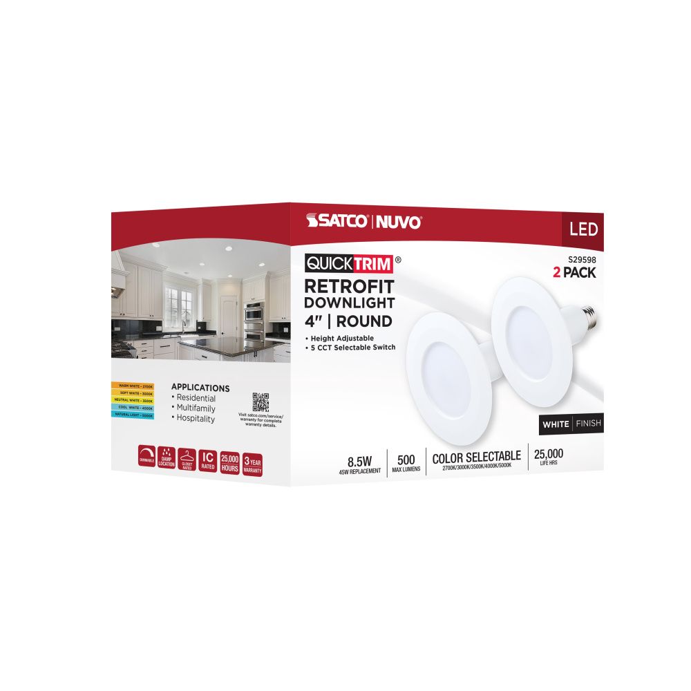 Designed as a direct replacement for traditional cans and reflector lamps, SATCO NUVO's S29598 4" LED QuickTrim Downlights are the easiest solution to upgrade downlighting on the market. The adjustable neck adapts to a variety of legacy recessed ho