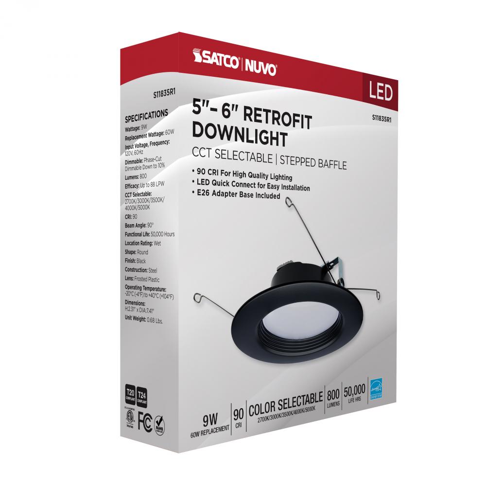 9 Watt; LED Downlight Retrofit; 5-6 Inch; CCT Selectable; 120 Volts; Black Finish