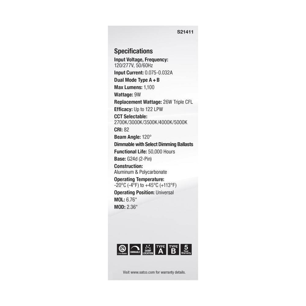 SATCO NUVO's Dual Position 9W 2-pin PL Lamp is the perfect blend of flexibility, functionality and innovation. Designed with versatility in mind, this lamp features a 90 degree rotatable head that allows light to be directed as needed in both vertical