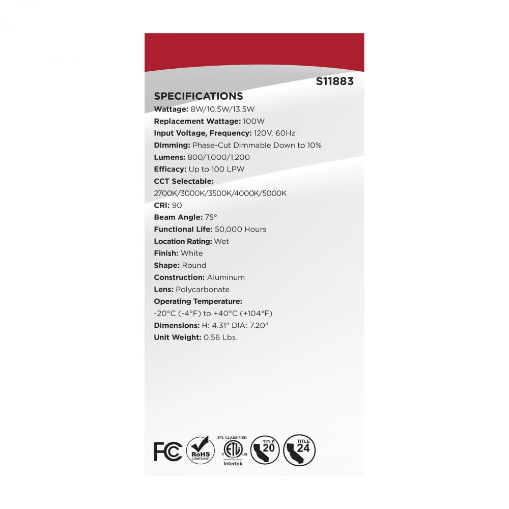 Field Selectable LED Downlight Retrofit; Deep Baffle; 8/10.5/13.5 Watts; 27K/30K/35K/40K/50K CCT; 5-6 Inch; Round Shape; White Finish; 120 Volts
