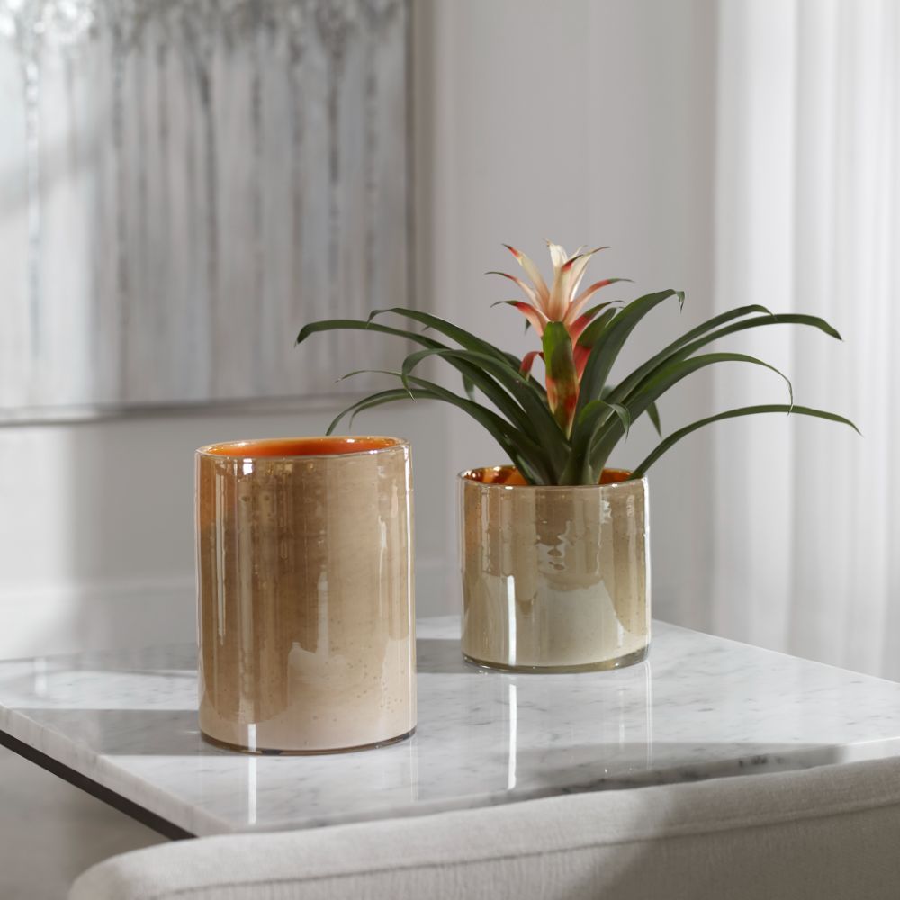 Handcrafted from glass, these vases showcase an iridescent bubbled exterior finish in light beige with a punch of vibrant orange inside. Sizes: S-6x6x6, L-6x8x6