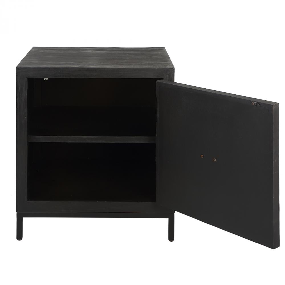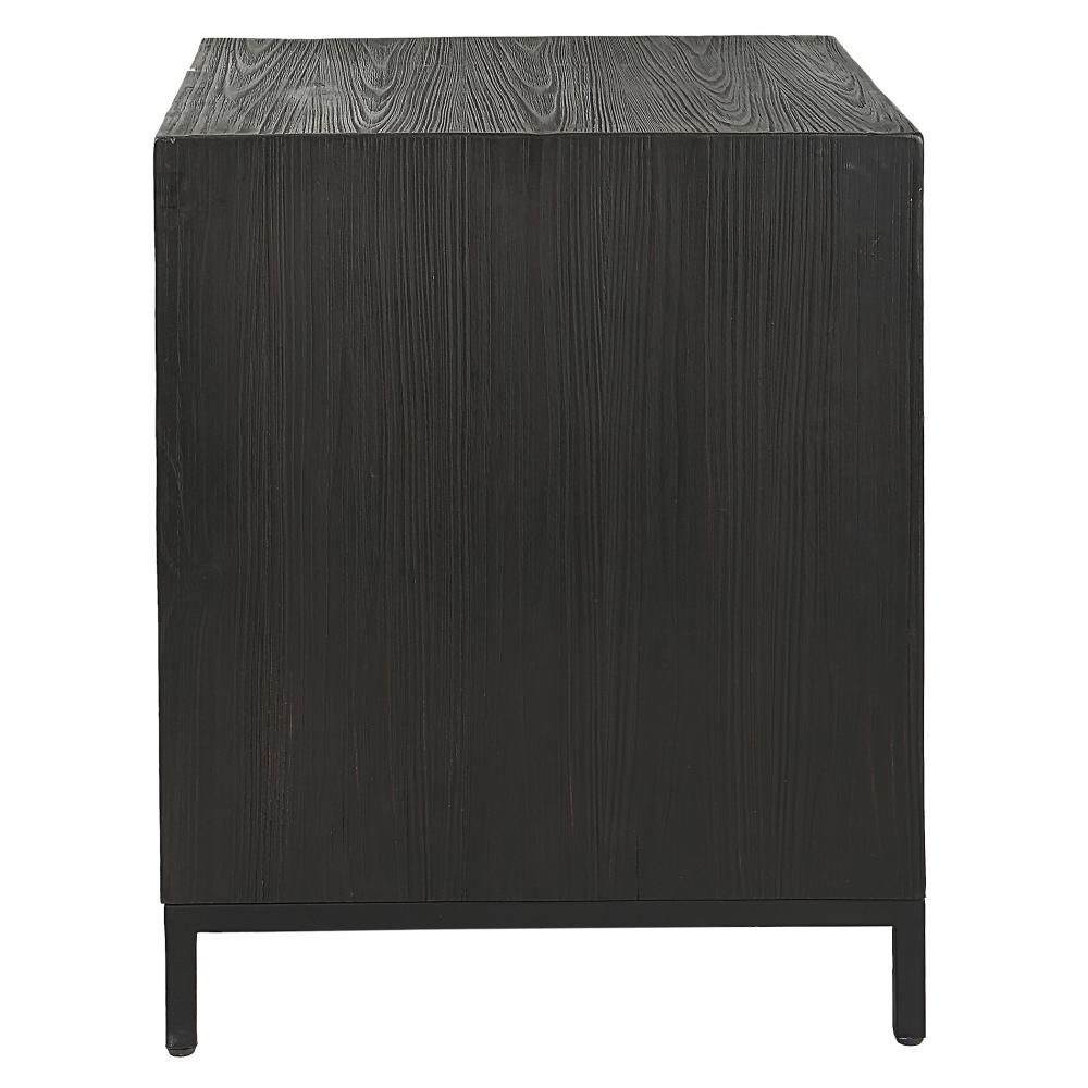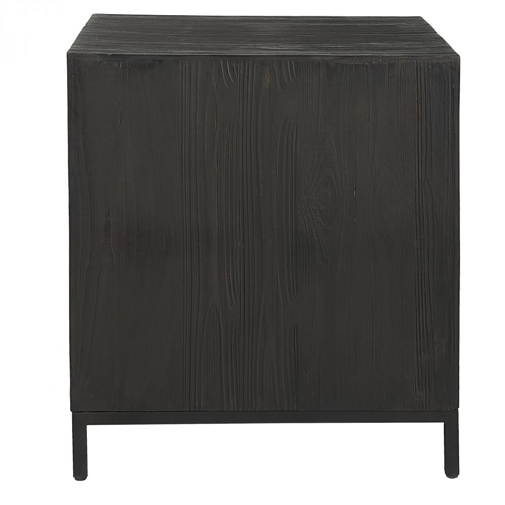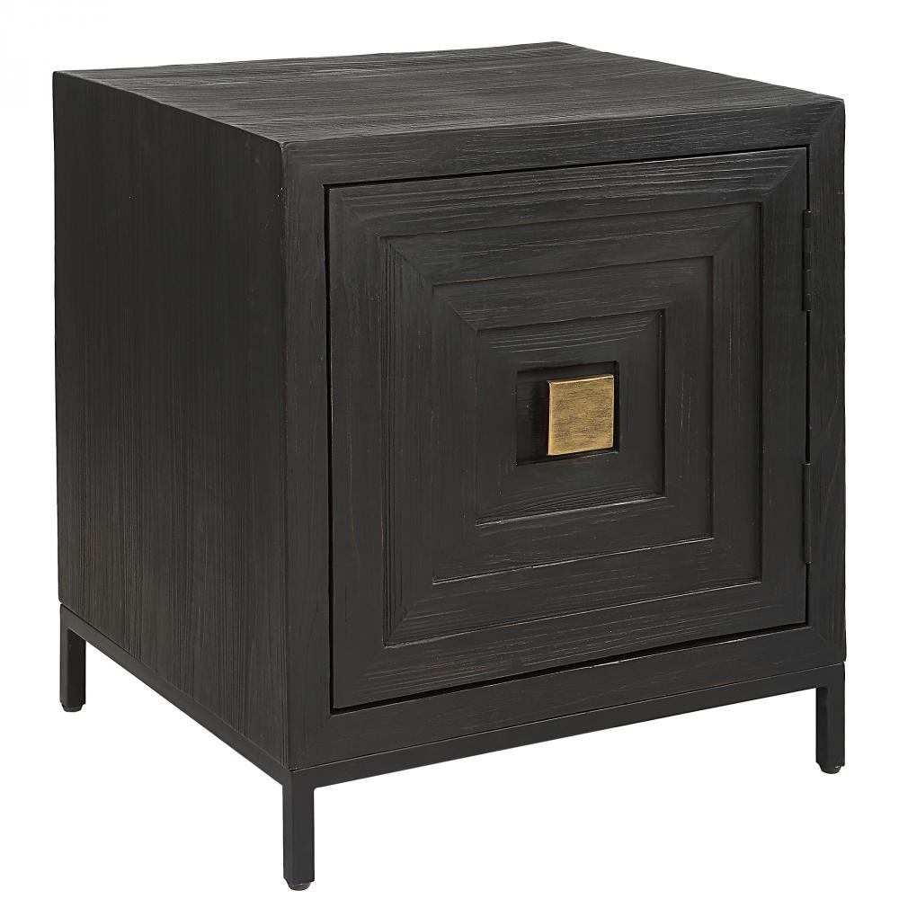 A Contemporary Geometric Accent Cabinet, Constructed From Deeply Grained Fir Wood Finished in A Dark Ebony Stain and Accented with Brushed Brass Hardware. Has One Fixed Interior Shelf.