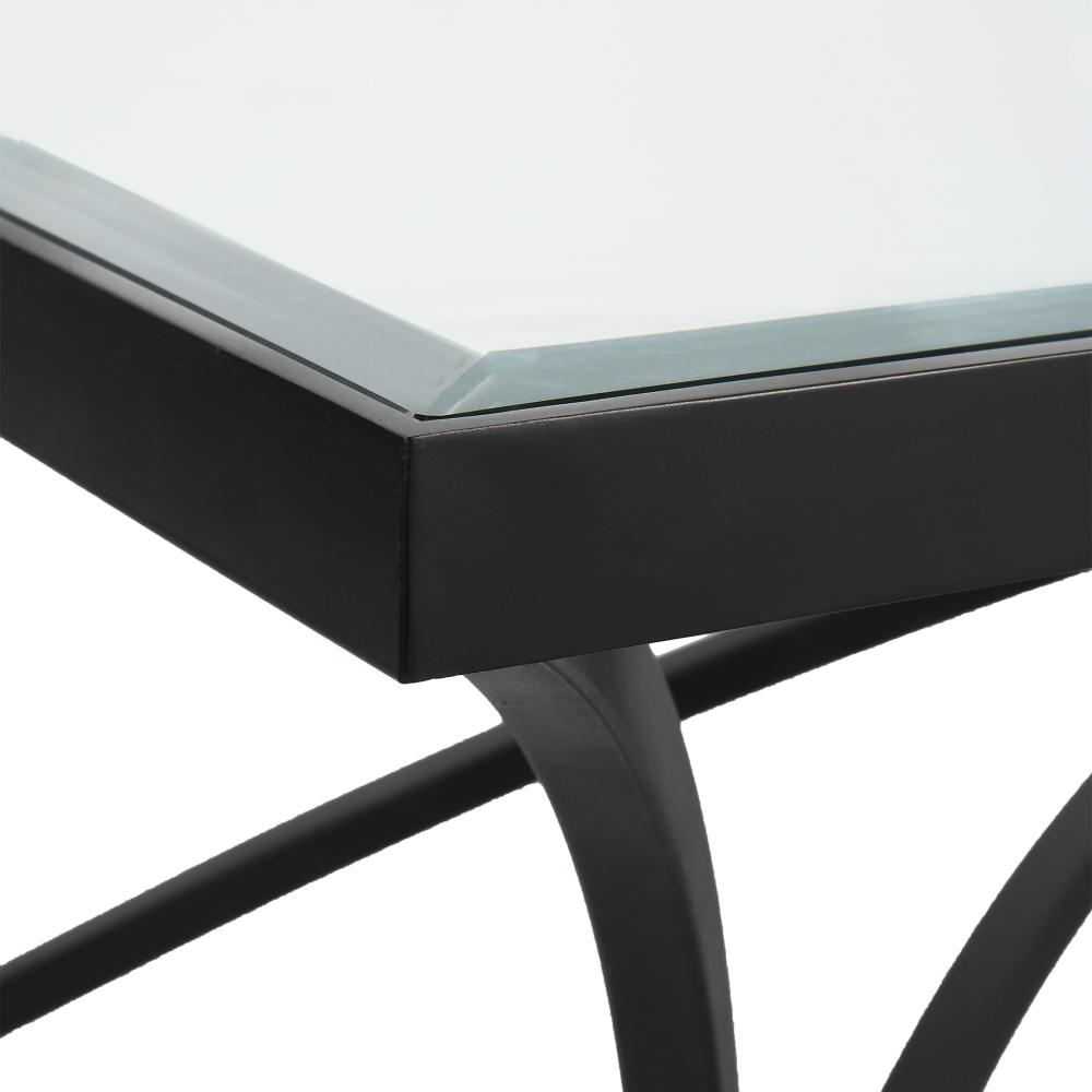 Gracefully Arched Hand Forged Metal Finished in Sleek Satin Black. Top is Clear Beveled Tempered Glass.