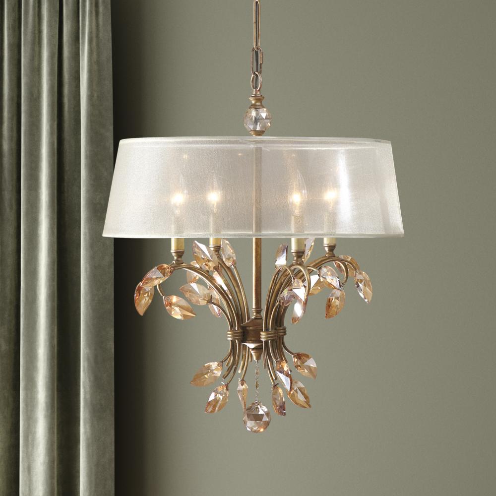 Burnished Gold Metal with Golden Teak Crystal Leaves and A Silken Champagne Sheer Fabric Shade. 4-60 Watt Max, Candelabra Sockets.Bulbs Not Included. Supplied with 12' Wire and 5' Chain for Adjustable Installation.