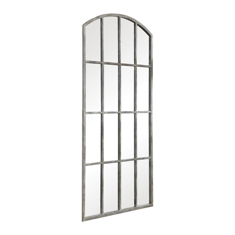 Contemporary and French Country Styles Merge in This Arched Mirror. Reminiscent of A Large Window, This Piece Features A Hand Forged Iron Construction with An Aged Rust Gray Finish That Has Been Distressed and Covered in An Off-white Wash.