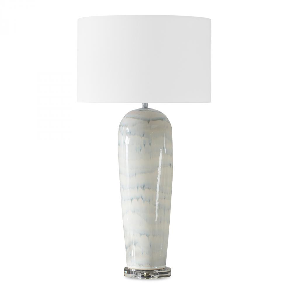 Featuring A Timeless White Ceramic Base Combined With Bands Of Melting Smoky Blue Glaze. This Piece Is Elegantly Anchored By A Thick Crystal Foot And Complemented With Brushed Plated Nickel Details. A Tapered Round Hardback Shade Covered In A White Linen Fabric. Due To The Nature Of Fired Glazes On Ceramic Lamps, Finishes Will Vary Slightly.