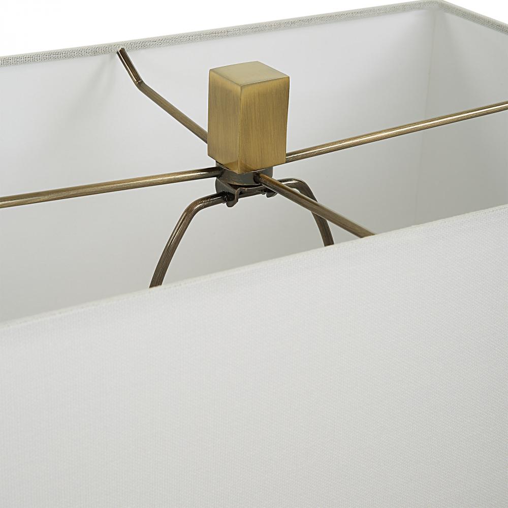 Contemporary in Design Yet Elegant in Style, This Table Lamp Features A Tapered Iron Base Finish in A Plated Antique Brass Topped with A Thick Crystal Ornament. The Rectangle Hardback Shade is A Crisp White Linen Fabric.