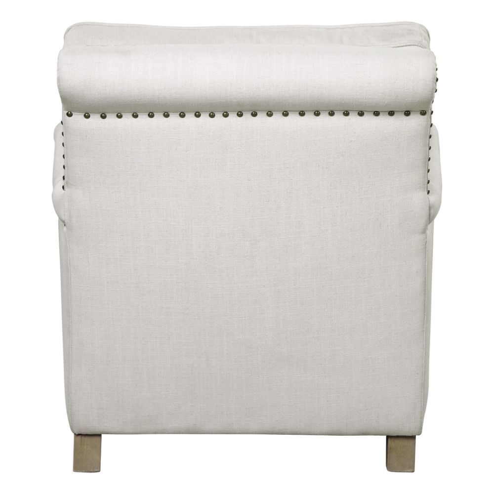 Classic Antique White English Arm Chair with Loose Box Cushions, Antique Brass Nail Head Trim and Hand Turned Legs in Distressed Honey Stain. Seat Height is 19".