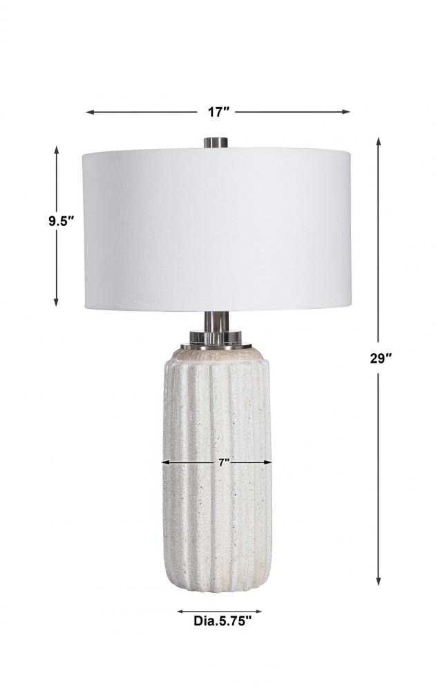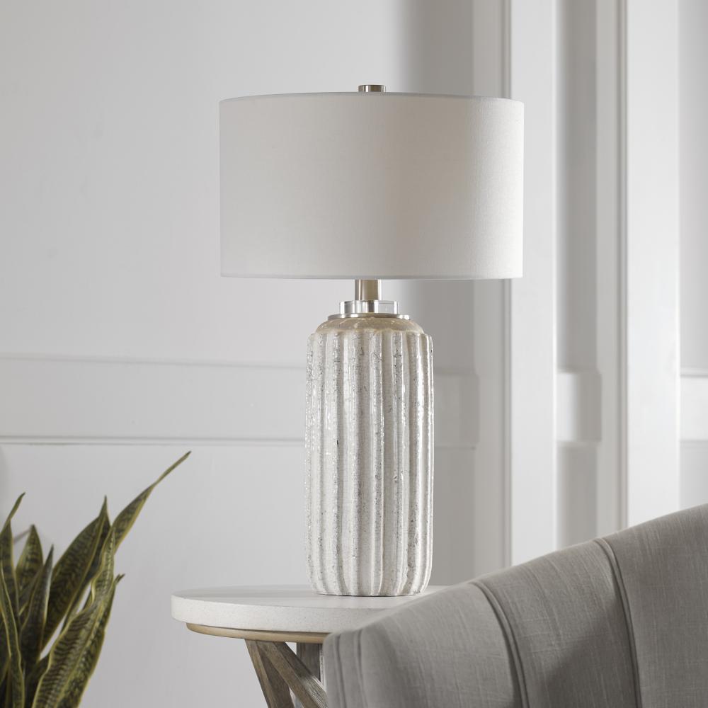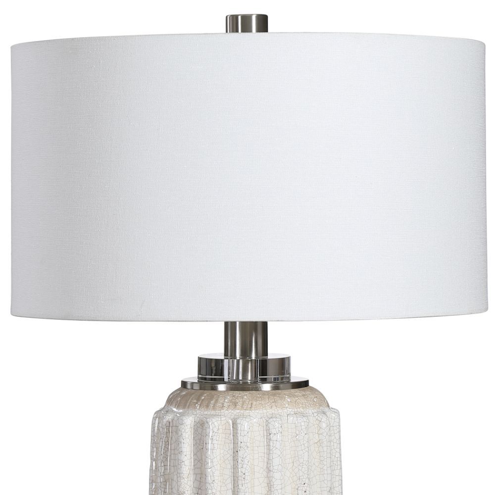 A Nod to Old-world Style, This Ceramic Table Lamp Features A Distressed Cream and Beige Crackle Glaze with A Deep Ribbed Texture, Accented By Brushed Nickel and Crystal Details. A White Linen Fabric Drum Shade Completes The Look.