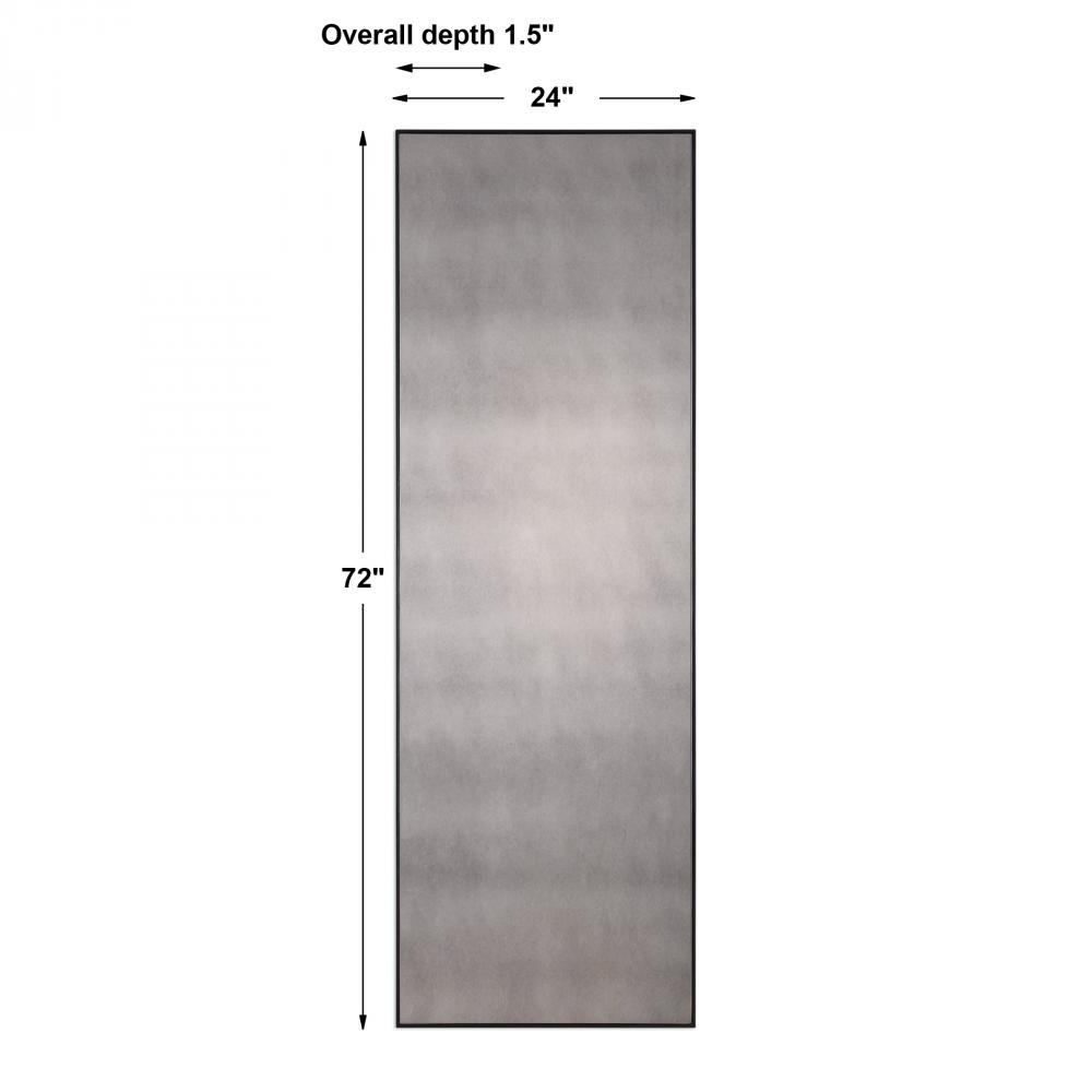 This Stately Mirror Features An Antiqued Style Mirror and Would Make A Great Addition to Any Room. The Narrow But Sturdy Metal Frame Has An Aged Black Finish. May Be Hung Horizontal or Vertical.