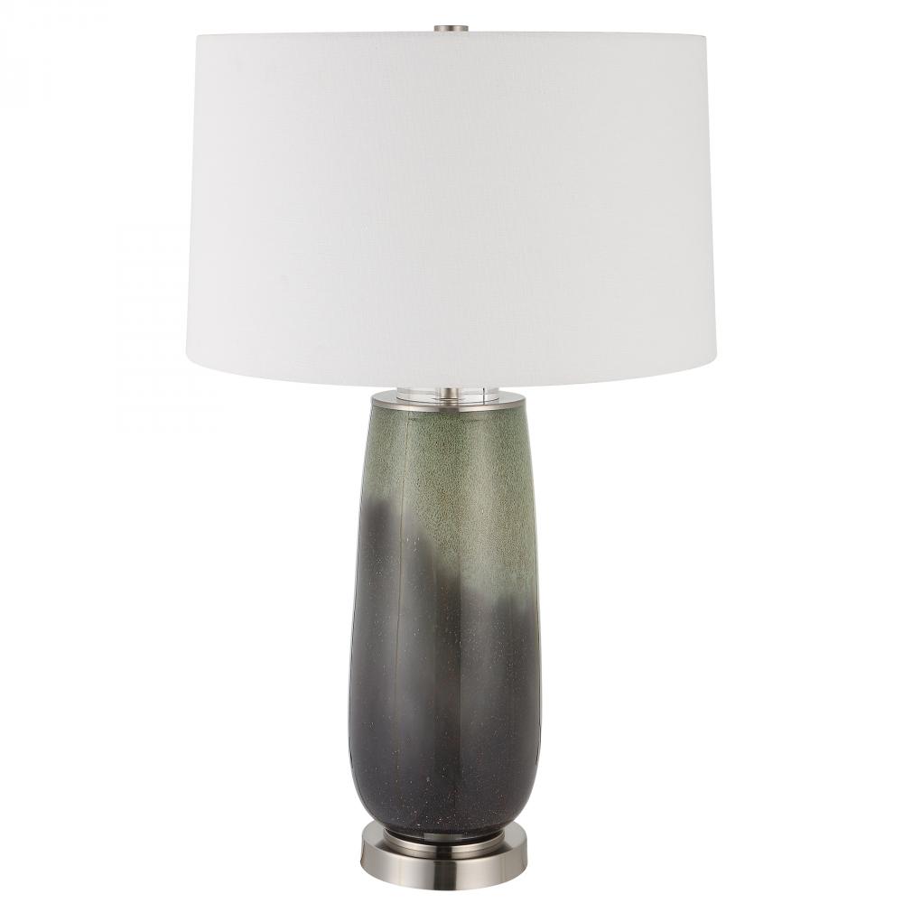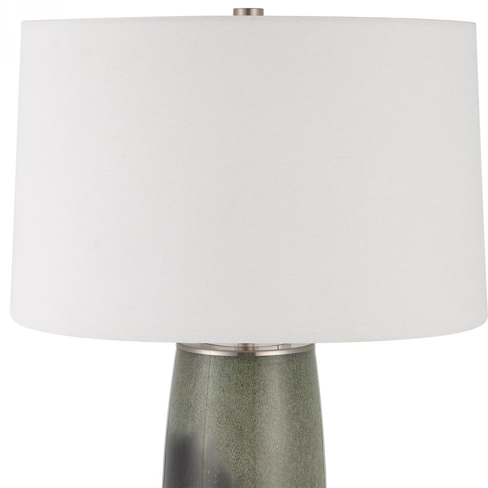 This Elegant Table Lamp Features A Beautiful Speckled Green and Gray-blue Ombre Glass Base with Crystal Accents and Brushed Nickel Finished Iron Details. The Hardback Shade Has A Slight Taper and is Covered in A White Cotton Fabric.