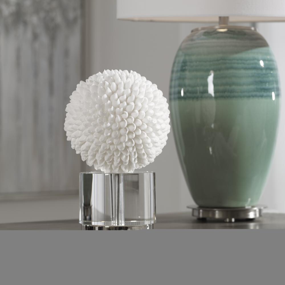 This Decorative Sphere is Handcrafted with Faux Sea Shells, Featured with Polished Nickel Plated Accents and Cylinder Shaped Crystal Base.