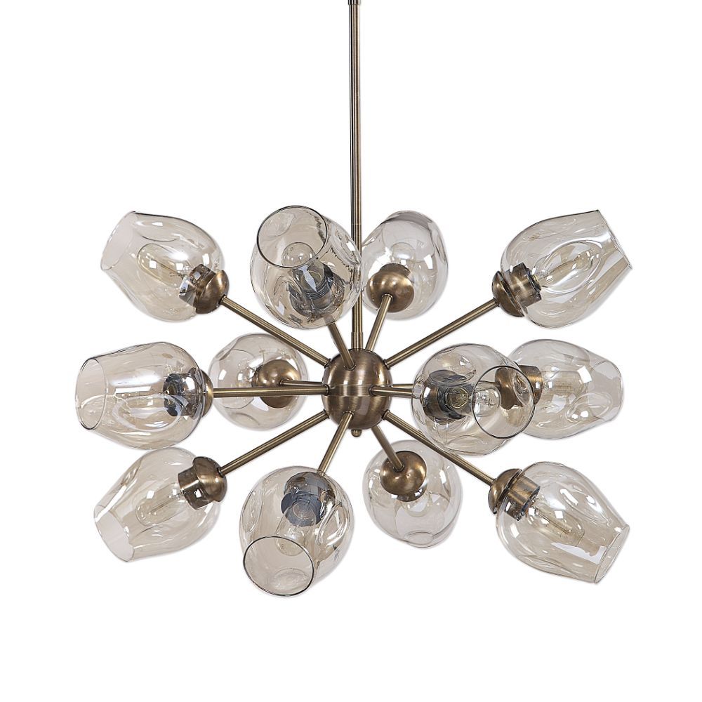 Transitional with A Flair of Mid-Century Sputnik Style, Our 12 Lt. Rod Hung Chandelier, Features A Warm Antique Brass Finish with Plated Amber Dimpled Glass Shades. 12-60 Watt Max, Edison Sockets. Bulbs Not Included. Supplied with 15' Wire, 3-12" Stems and 1-6" Stem for Adjustable Installation.