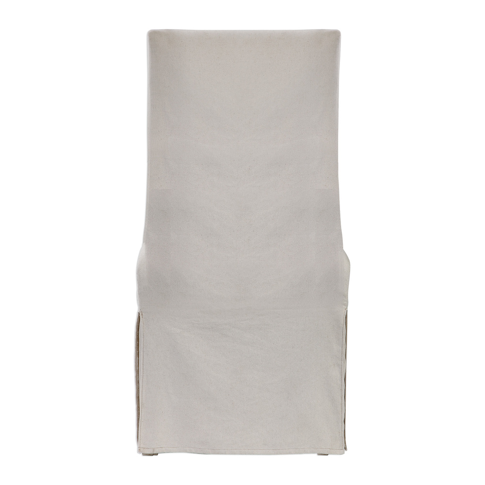 Simplistic in Form, This Casually Sophisticated Armless Chair Features A Tailored Off-white Linen Blend Slipcover with A Plush Cushion Seat and Kidney Pillow for Added Comfort, with Added Performance Treatment to Resist Soiling and Stains. Seat Height is 20". Dry Clean Only.