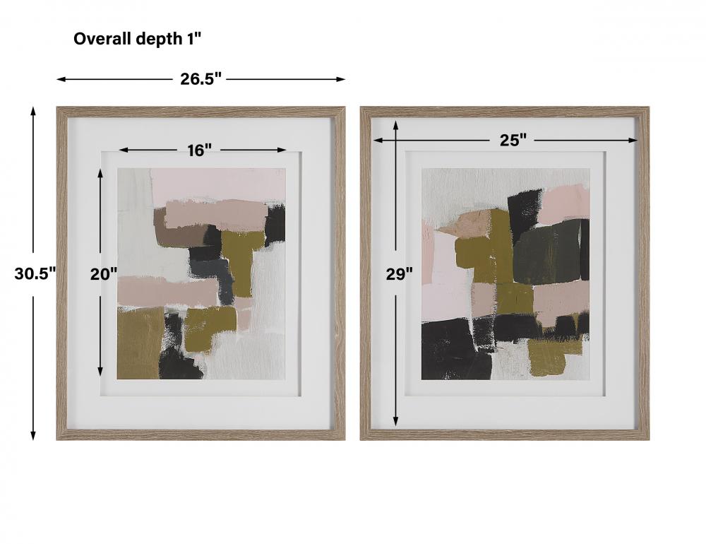 This Set of Framed Prints Showcases Abstract Compositions in Cool Olive, Mauve, Rose, and Gray Tones. Each Piece of Art is Placed Under Glass and Surrounded By Double White Matting and A Solid Wood Frame in A Light Oak Finish. Artwork By Jennifer Goldberger.