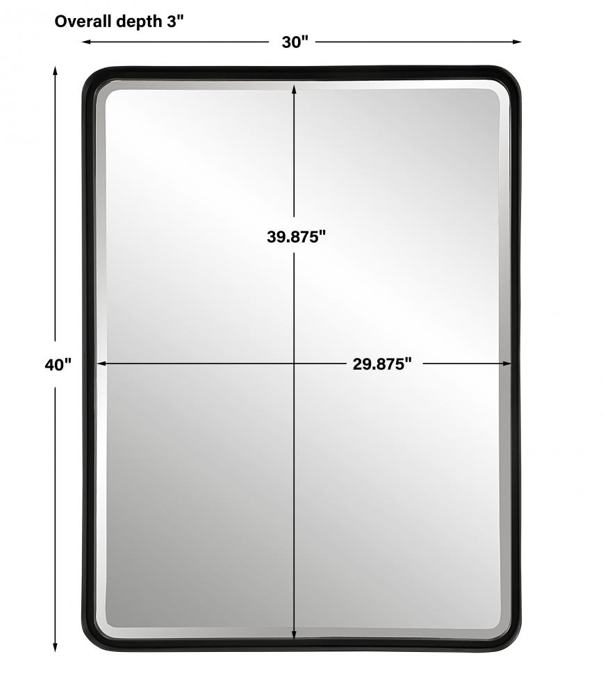 This Mirror Features A Deep Metal Band Surrounding An Offset Inner Ledge Finished in A Sleek Satin Black. Mirror Has A Generous 1 1/4" Bevel and May Be Hung Horizontal or Vertical.
