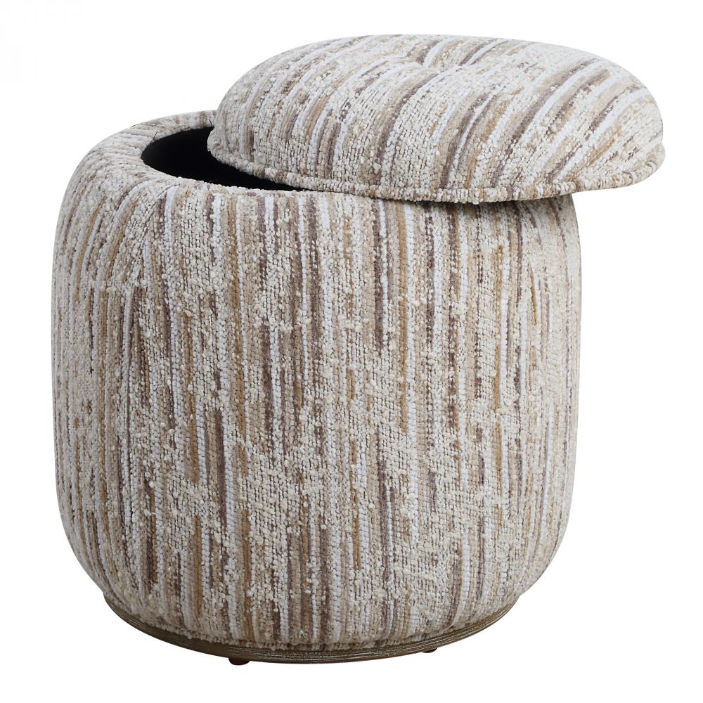A Statement Stripe Also Acting As A Neutral, The Dialogue Accent Stool Features A Slubbed Boucle Polyester In Ivory, Tan And Brown Tones Over An Oak Finished Solid Wood Base With Beige Ceruse. Top Is Removable For Extra Storage.