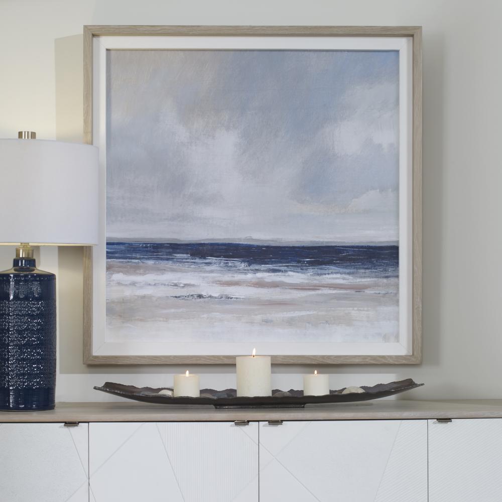 This Transitional Depiction of A Coastal Scene Showcases A Neutral Gray and Taupe Color Palette Accented By Deep Cobalt Blue. A Natural Linen Inner Liner and Pine Wood Frame Enhance This Tranquil Piece. Artwork By Tim O'Toole.