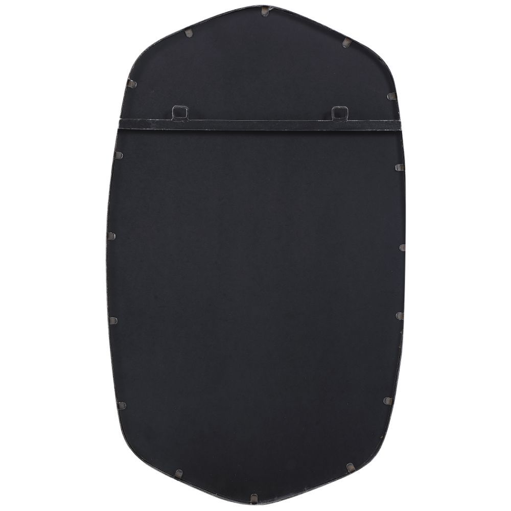 This Hand Forged Iron Mirror Frame Features A Unique Shape with Elegant Curves, Finished in A Versatile Silver Leaf. Mirror Has A Generous 1 1/4" Bevel.
