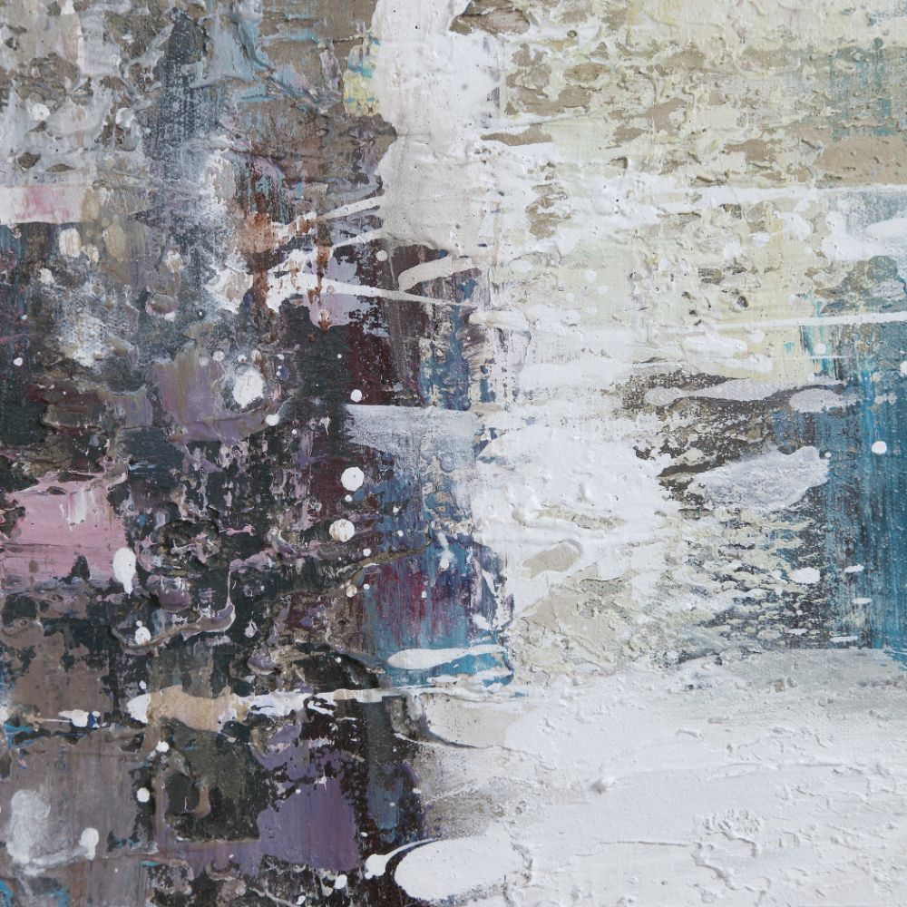 Hand Painted Artwork on Canvas Exhibits An Array of Color Including Lavender, Aqua, White, and Tan. A Gold Leaf Gallery Frame Completes The Abstract Piece, Which May Be Hung Horizontal or Vertical.