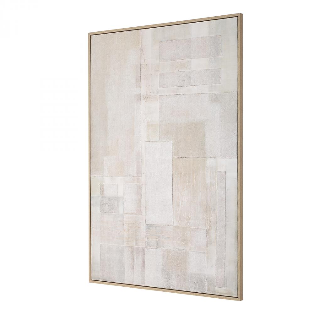 Erase Hand Painted Canvas Is A Stunning Mixed Media Abstract Featuring Warm, Neutral Earth Tones. Its Textured Layers And Natural Palette Evoke A Sense Of Calm And Renewal, And A Gallery Frame Finished In A Light Oak Veneer Completes The Piece. Due To The Handcrafted Nature Of The Artwork, Each Piece May Have Subtle Differences. This Piece May Be Hung Horizontal Or Vertical.