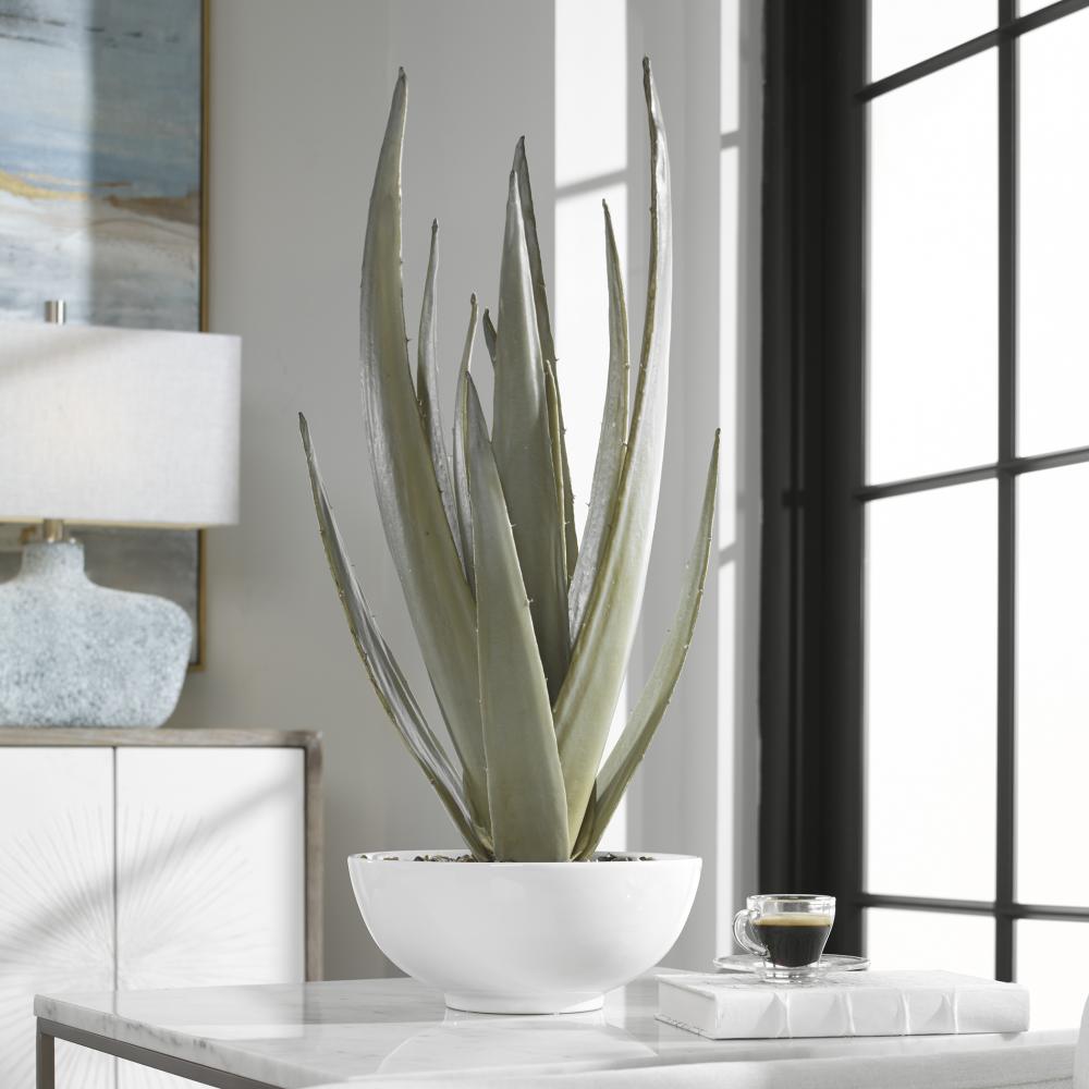 A Contemporary Aloe Vera Statement Piece, Accented with Natural Stones Set Into A Glossy White Textured Bowl.