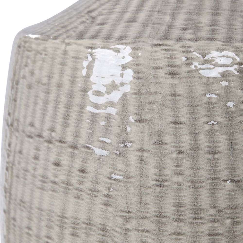 This Ceramic Base Keeps It Simple in Shape, Yet Upscale with Its Fashionable Pattern That's Finished in A Distressed Light Gray Glaze, Paired with Brushed Nickel Plated Accents. The Hardback Drum Shade is Light Gray Linen Fabric.