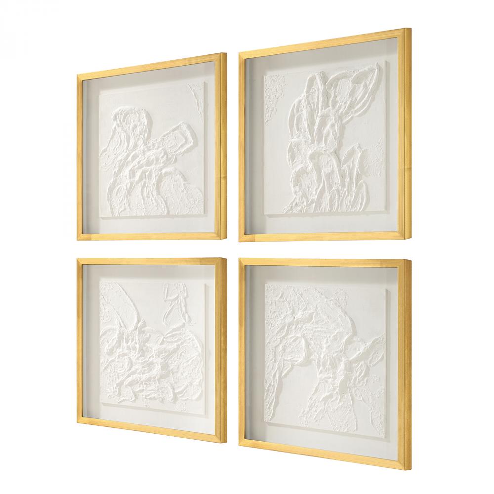 Hand Painted Abstracts, These Elegant Pieces Of Art Exhibit Thick Dimensional Texture And An All-white Color Pallet. A Light Gold Finished Shadow Box Frame Under Glass Surrounds Each Piece. Due To The Handcrafted Nature Of This Artwork, Each Piece May Have Subtle Differences. May Be Hung Horizontal Or Vertical.