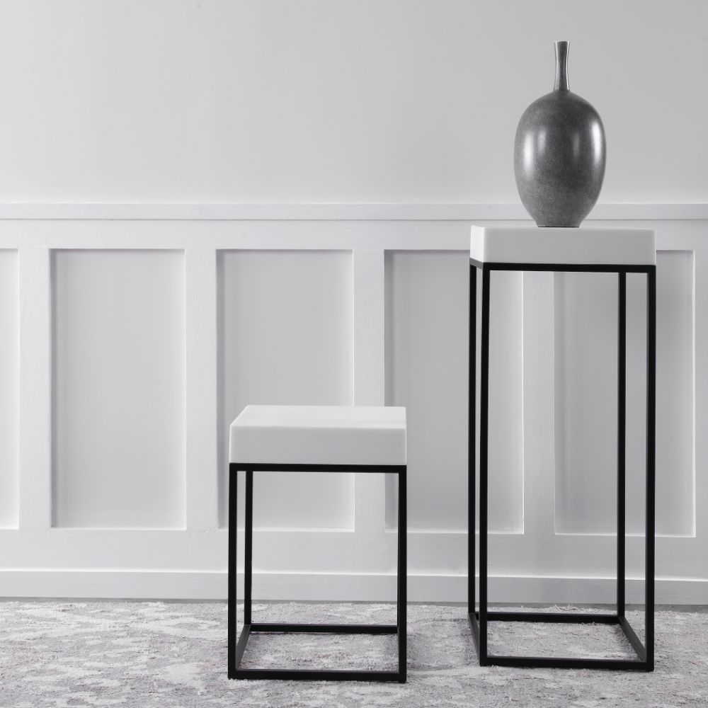 This Modern Plant Stand Combines A White Marble Look, Atop A Simple Steel Base Finished in Aged Black.