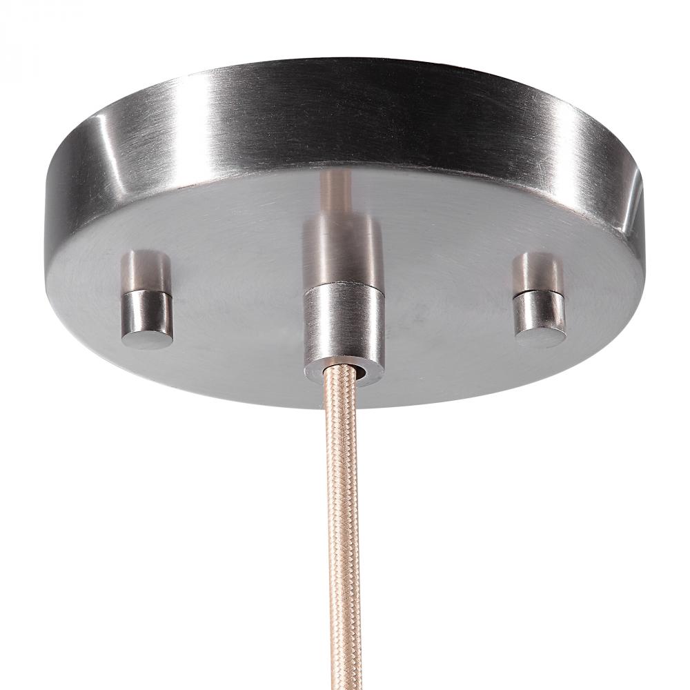 Blue Aqua Stone Glass is The Focus of This 1 Lt. Pendant with Beige Fabric Cord and A Brushed Nickel Metal Finish. This Unique Glass When Off Has A Warm Blue Look and When on You See A Stone Pattern with Aqua and Cream. 1-60 Watt Max, Edison Socket. Bulbs Not Included. Supplied with 15' Cord for Adjustable Installation.