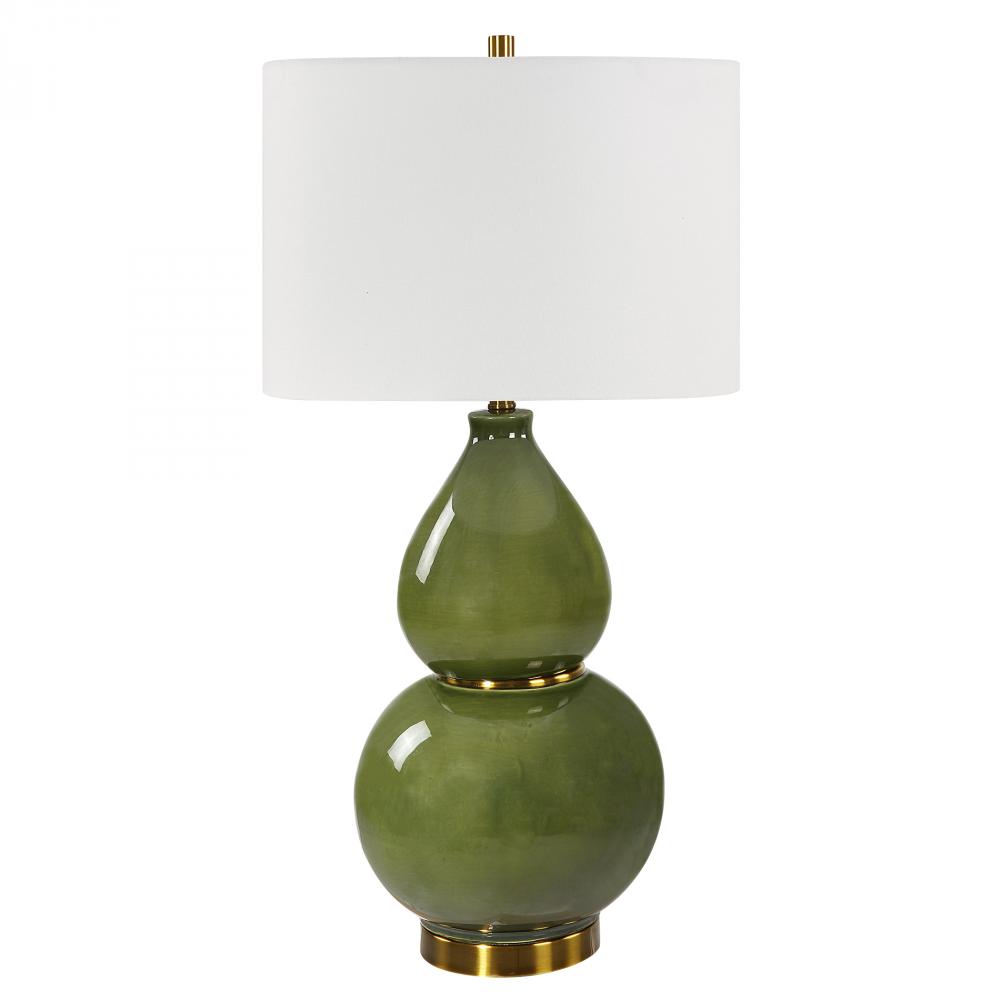 This Timeless Gourd Shaped Ceramic Base is Finished in A Moss Green Glaze Accented with Lightly Antiqued Brass Plated Details. The Round Drum Shade is Made of White Linen Fabric. Due to The Nature of Fired Glazes on Ceramic Lamps, Finishes Will Vary Slightly.