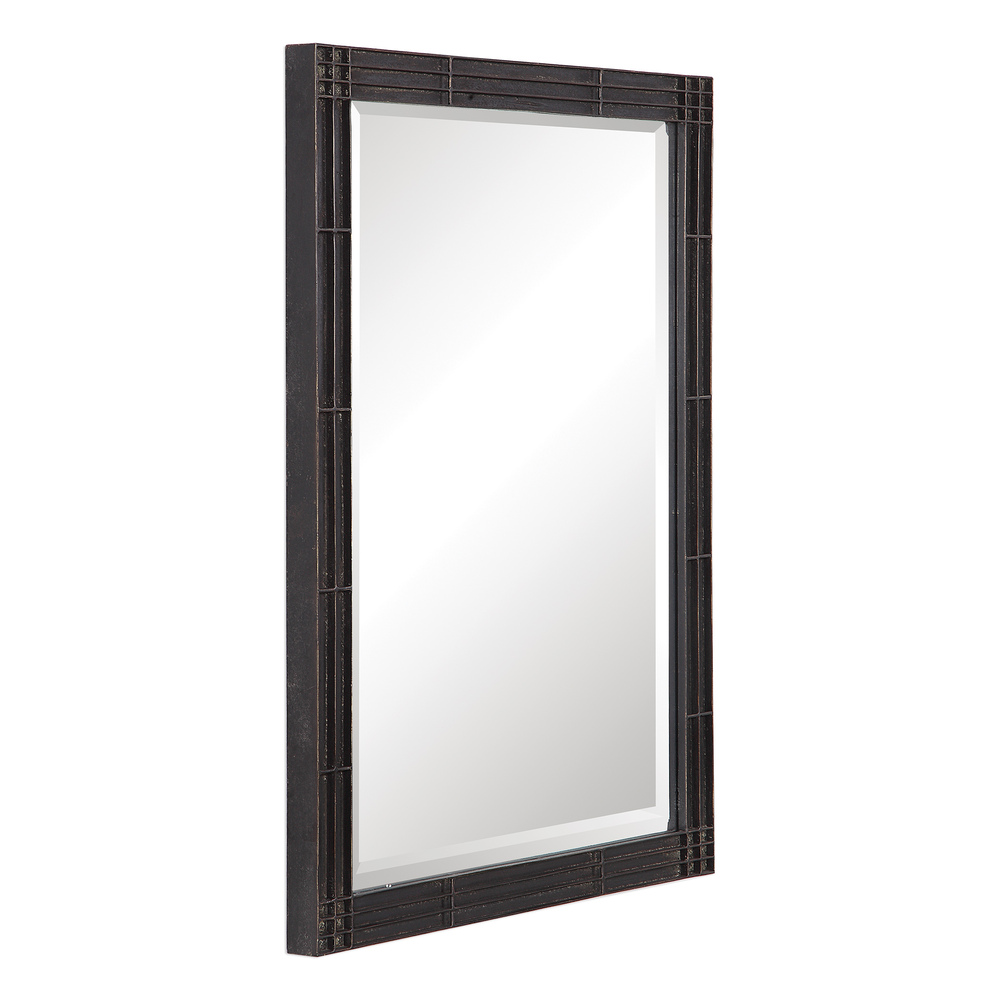 Crafted From Hand Forged Iron, This Rectangular Mirror Features Raised Geometric Detailing Finished in A Rustic Aged Black with Subtle Silver Highlights and A Gray Patina Wash. The Mirror is Surrounded By A Generous 1 1/4" Bevel and May Be Hung Horizontal or Vertical.