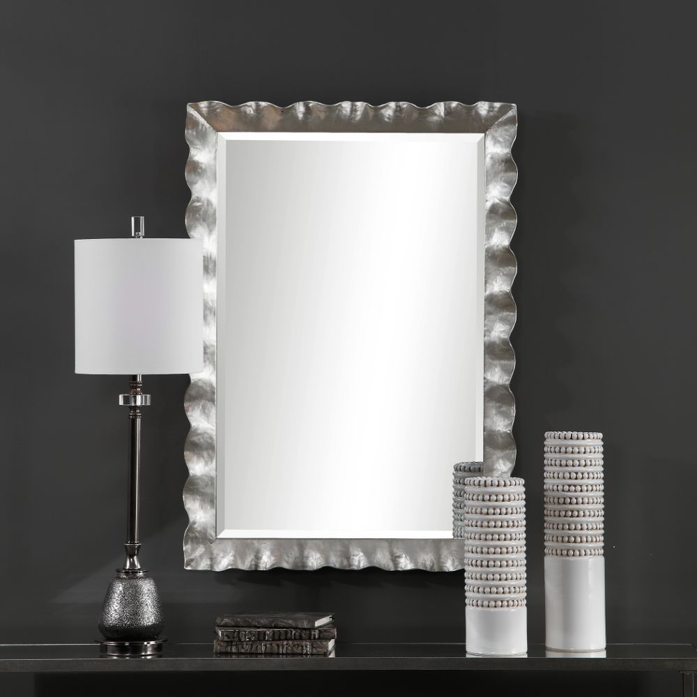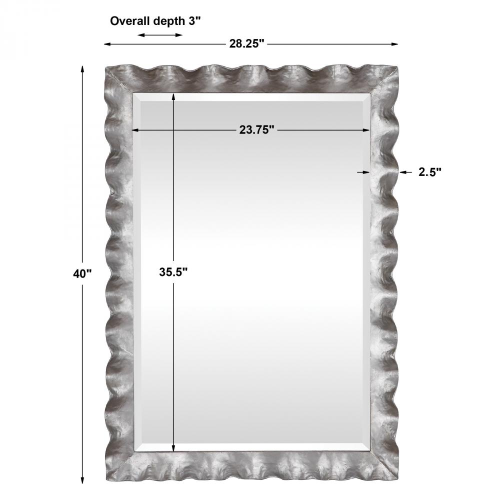 This Mirror Features A Hand Forged Metal Frame Finished in Silver Leaf with An Organic, Scalloped Edge Design. A Generous 1 1/4" Bevel is Added to This Piece, Which May Be Hung Horizontal or Vertical.
