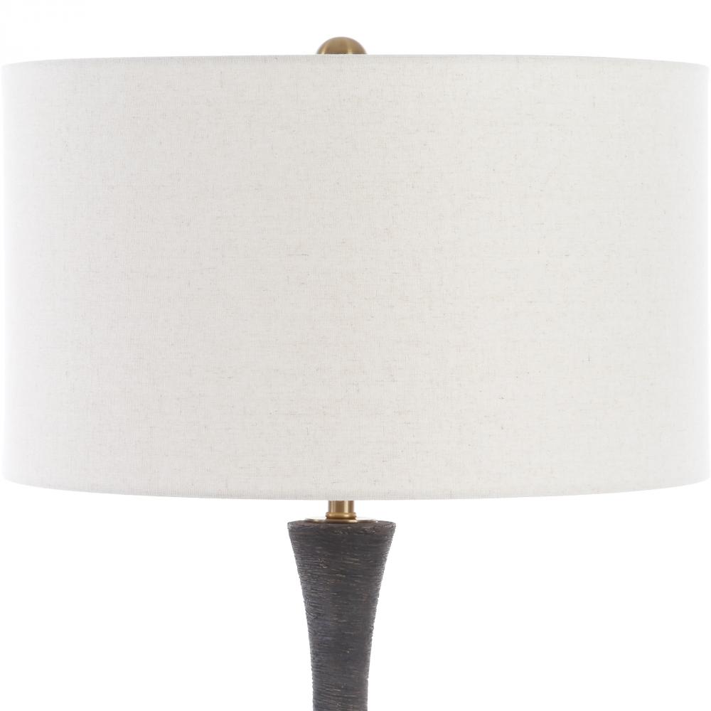 This Ceramic Table Lamp Features A Heavy Horizontal Texture Finished In A Rustic Dark Charcoal Glaze, Accented With Plated Brass Details. A Round Hardback Drum Shade Finished In A Casual Off-white Linen Fabric Completes The Piece.