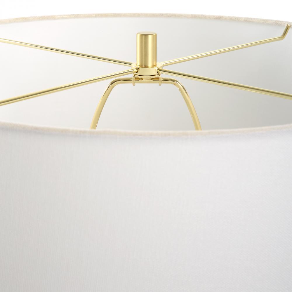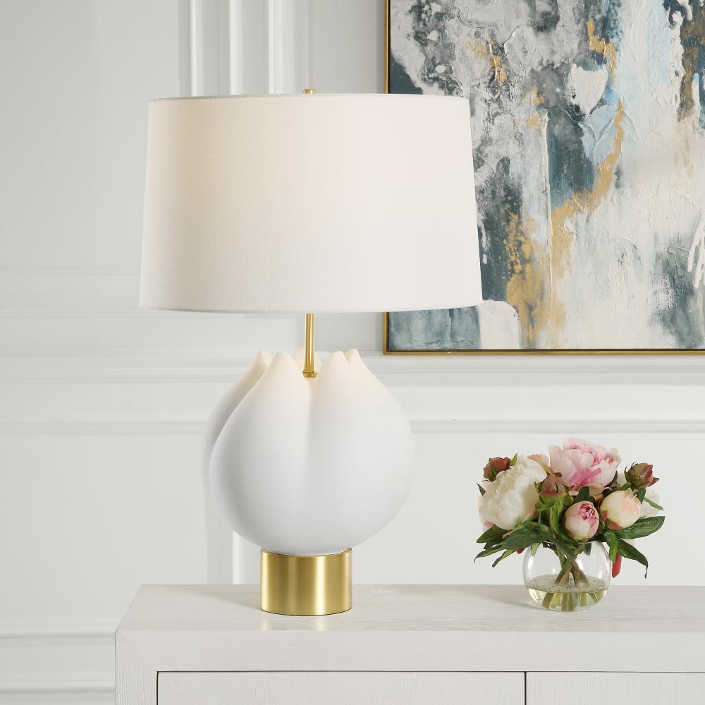 Inspired By Budding Flowers, The in Bloom Table Lamp Features A Porcelain Body with Subtle Texture, Finished in A Chalk White Glaze Paired with Lightly Antiqued Brass Plated Details. The Tapered Round Hardback Shade Completes The Piece in A Casual White Linen Fabric.