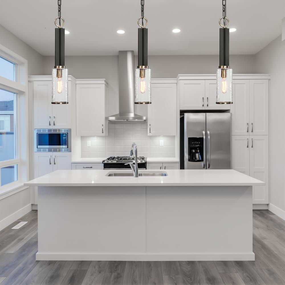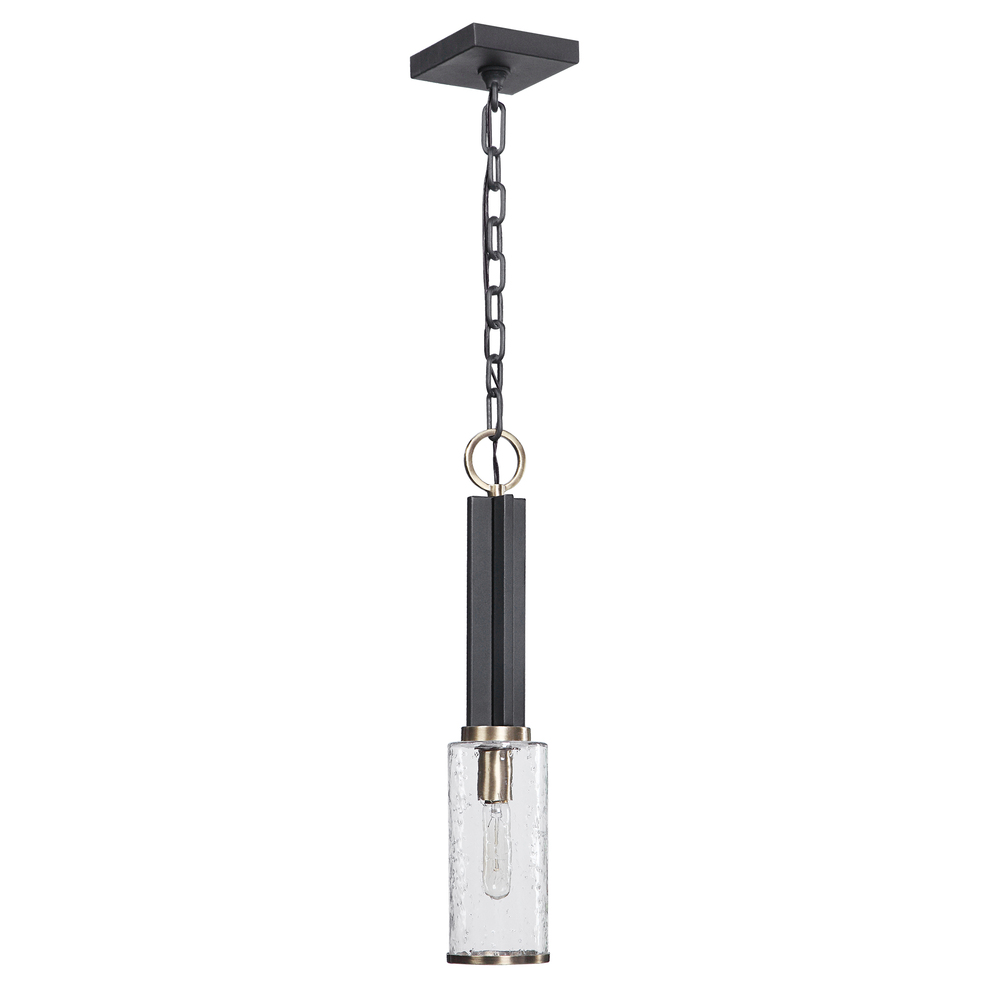 Refined Industrial with Clean Lines on Our 1 Lt. Mini Pendant Features A Sanded Black Finish on The I-beam Style Frame with Refined Antique Brass Accents and Clear Meteor Shower Glass Shade. 1-60 Watt Max, Edison Socket. Bulbs Not Included. Supplied with 12' Wire and 5' Chain for Adjustable Installation.