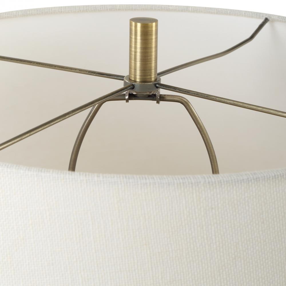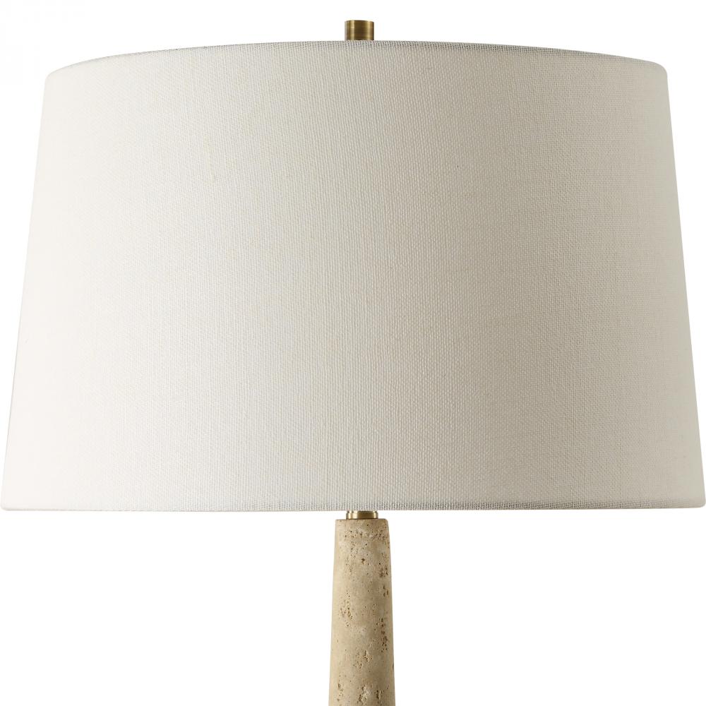 Crafted From Faux Travertine With Organic Texture, This Lamp Exudes Timeless Charm And Sophistication. Its Plated Antique Brass Foot And Matching Finishes Add A Touch Of Warmth And Luxury. A Slightly Tapered Round Hardback Shade In White Linen Completes The Piece.